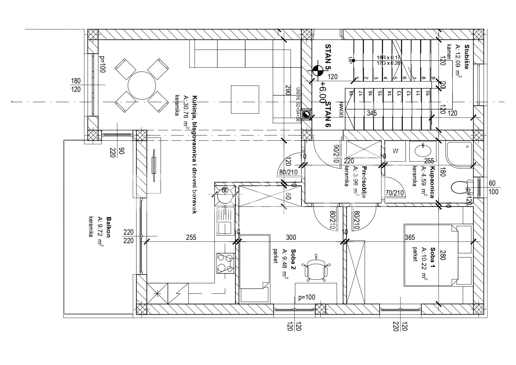 Stan se sastoji od dnevnog boravka s kuhinjom i blagovaonicom, dvije spavaće sobe, kupaonice, hodnika, predsoblja te prostrane terase. Uz stan dolazi i pripadajuće spremište u podrumu te vanjsko parkirno mjesto.