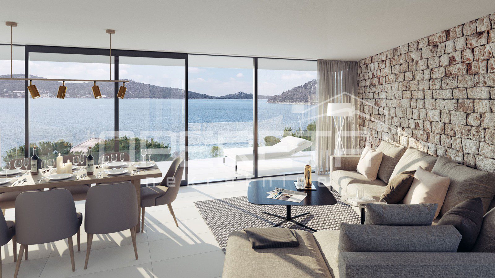 Središnji dio stana čini impresivan otvoreni prostor u kojem su skladno objedinjeni dnevni boravak, kuhinja i blagovaonica. Ova velika i svijetla cjelina osmišljena je tako da stvara osjećaj prostranosti, slobode i povezanosti s okolinom, a iz dnevnog boravka, kao i iz glavne spavaće sobe, izlazi se na veliku terasu koja se nadvija iznad morske obale.