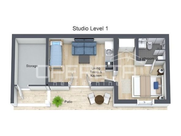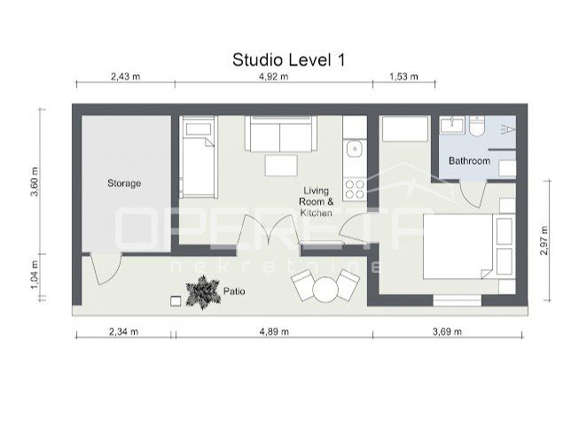 Sastoji se od prostrane dnevne sobe s kuhinjom, spavaće sobe i kupaonice (29,56 m²), natkrivene i ograđene terase (8,69 m²) i spremišta (7,48 m²).