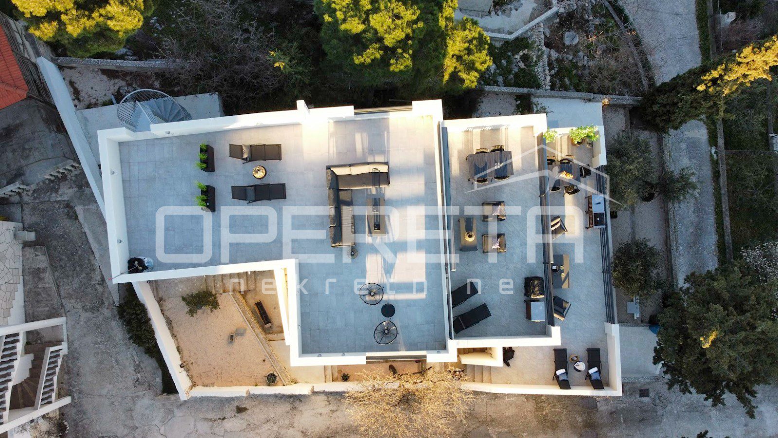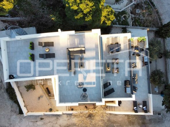 Kuća se prostire na tri etaže i ima zajedničku krovnu terasu s prekrasnim pogledom.