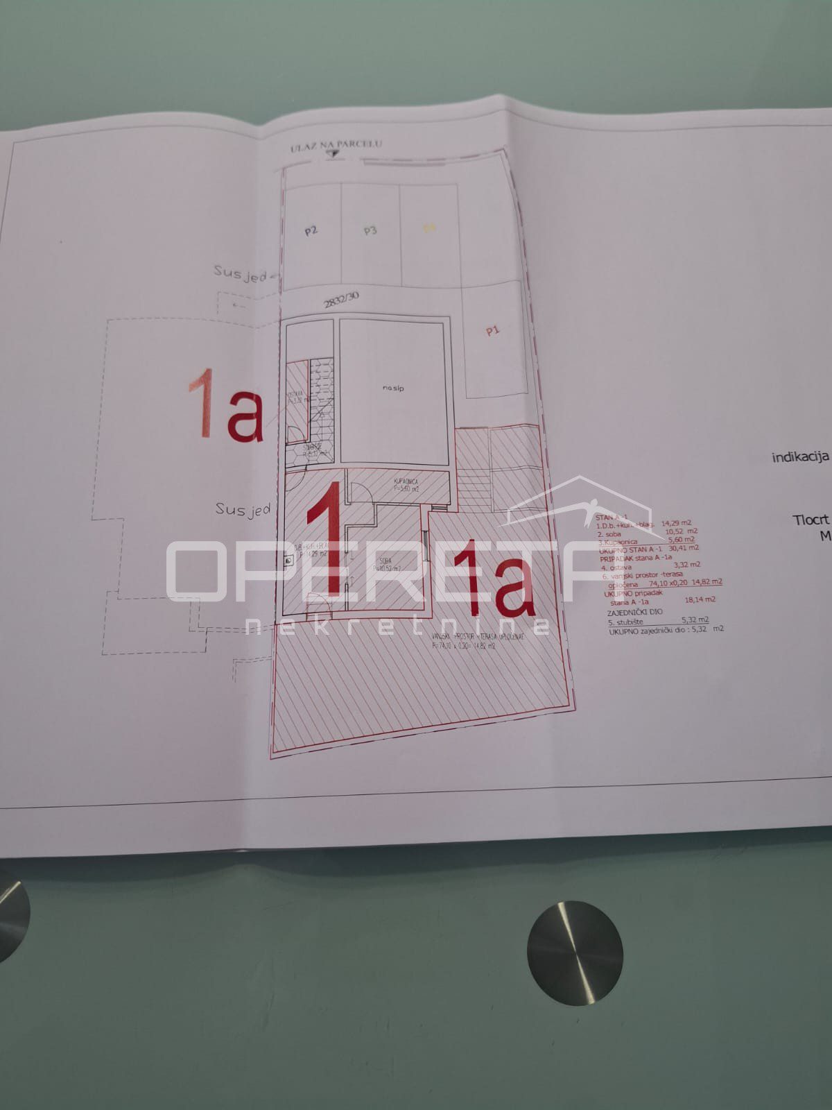 Ukupna korisna površina stana iznosi 120,33 m², od čega je 45 m² stambenog prostora, dok popločana terasa zauzima čak 74,10 m², što ga čini idealnim za život ili odmor u mediteranskom okruženju.