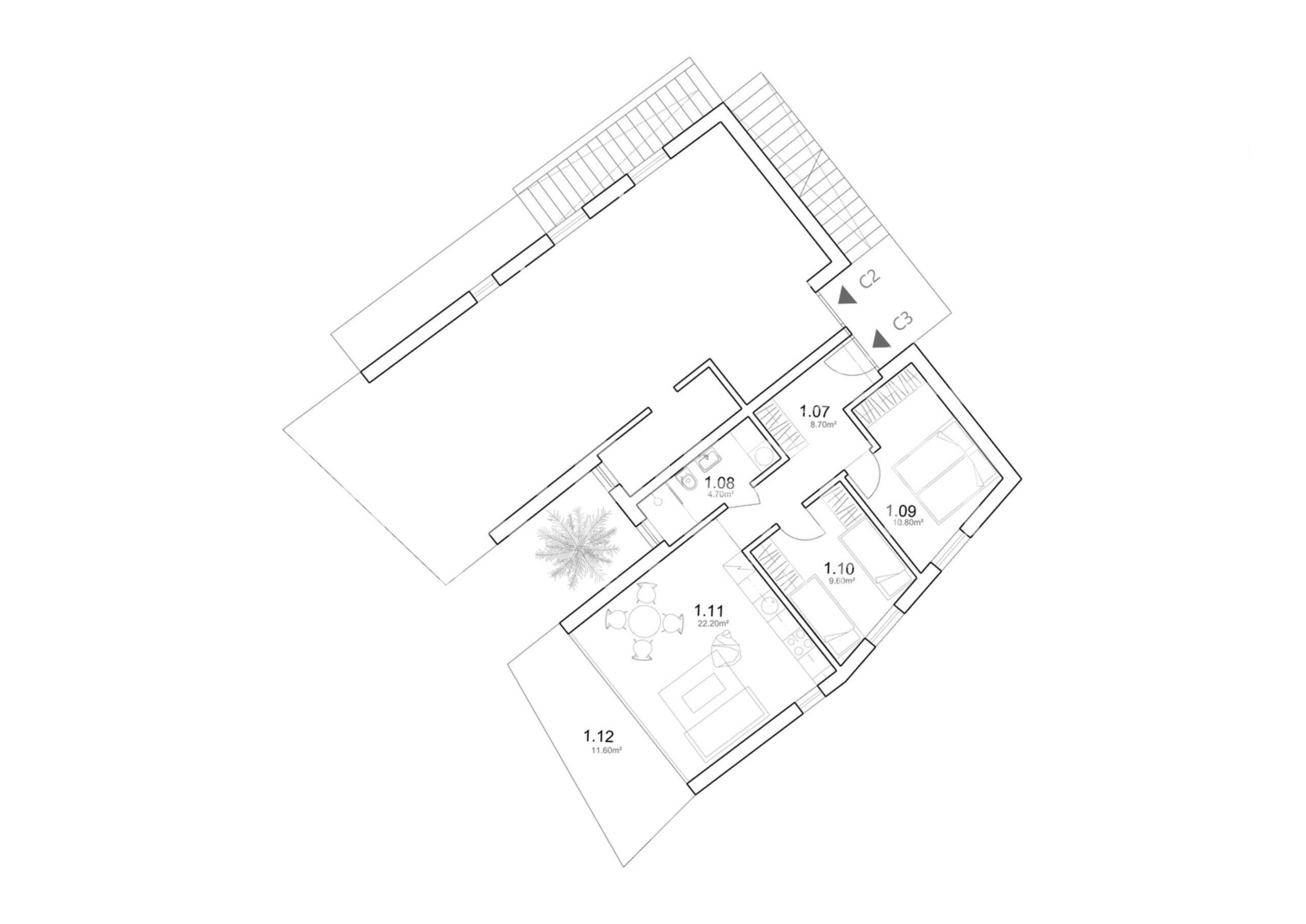 Stan je pažljivo osmišljen kako bi svakodnevni boravak bio što ugodniji i jednostavniji. Odmah po ulazu, s lijeve strane, smještene su dvije spavaće sobe – mirni i privatni prostori pogodni za obitelj, goste ili radni kutak. S desne strane nalazi se moderno uređeno kupatilo s WC-om, opremljeno kvalitetnim sanitarijama i neutralnim tonovima koji pridonose dojmu elegancije i svježine.