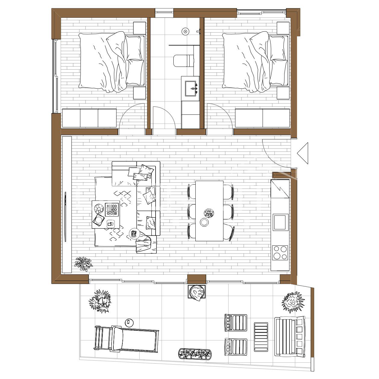 Stan se sastoji od dnevnog prostora s kuhinjom i blagovaonicom površine preko 30m2, dvije spavaće sobe, jedne kupaonice i terase veličine 20 m2. Uz stan dolazi jedno vanjsko parkirno mjesto.
