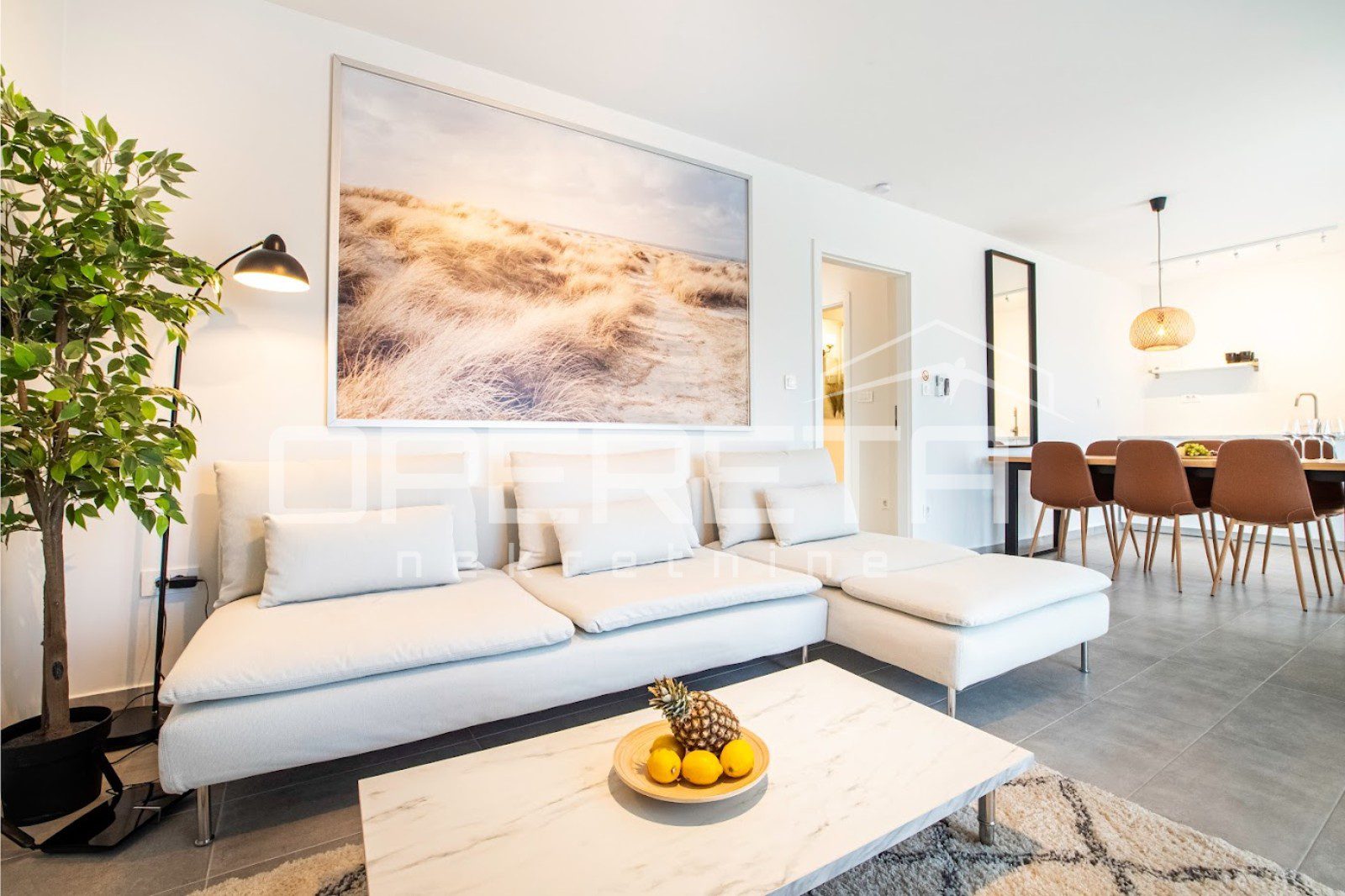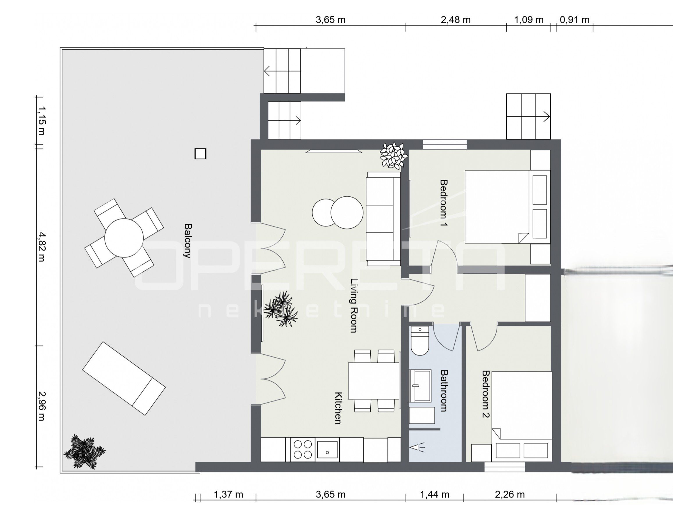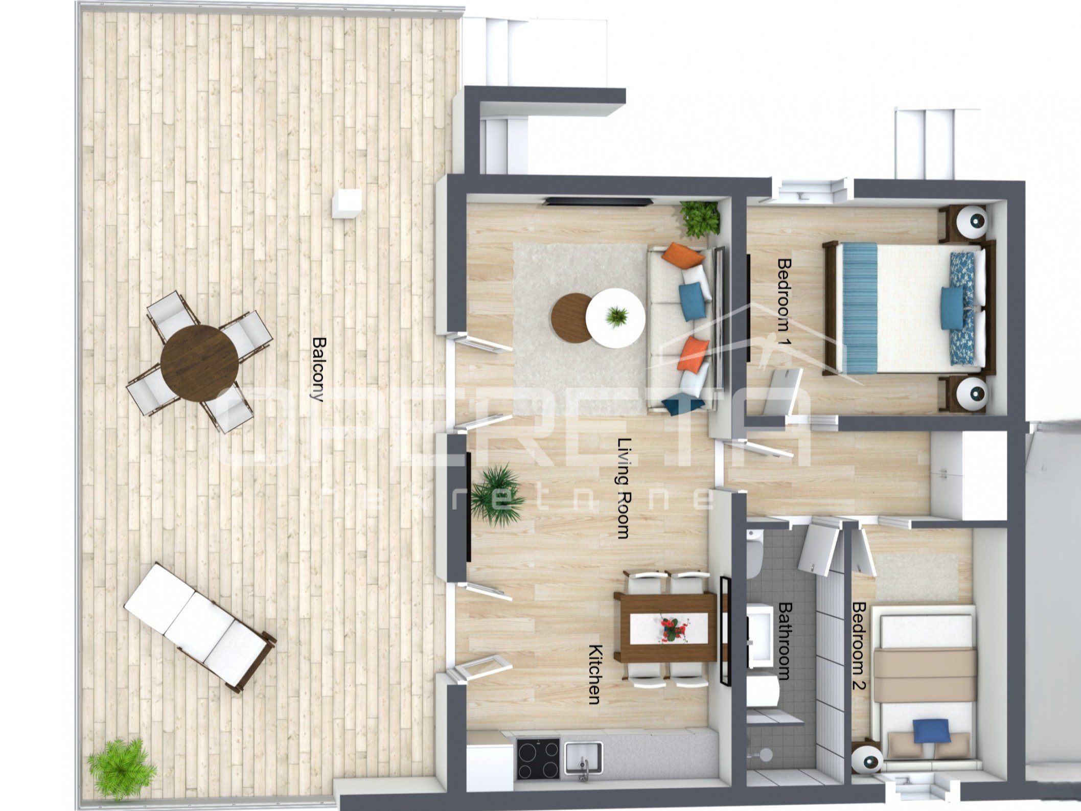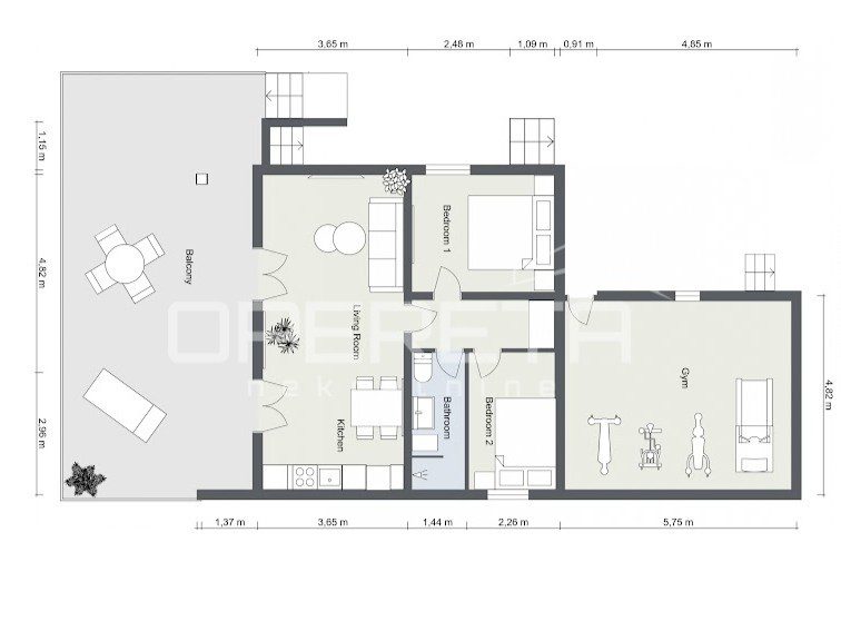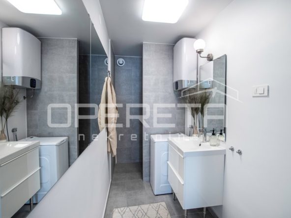 Prostrana dnevna soba s kuhinjom, dvije spavaće sobe i kupaonica protežu se na 56,95 m², dok dodatni komfor pružaju natkrivena terasa od 11,64 m² i nenatkrivena terasa od 36,29 m² s predivnim, neometanim pogledom na more. Stanu pripada osigurano parkirno mjesto.