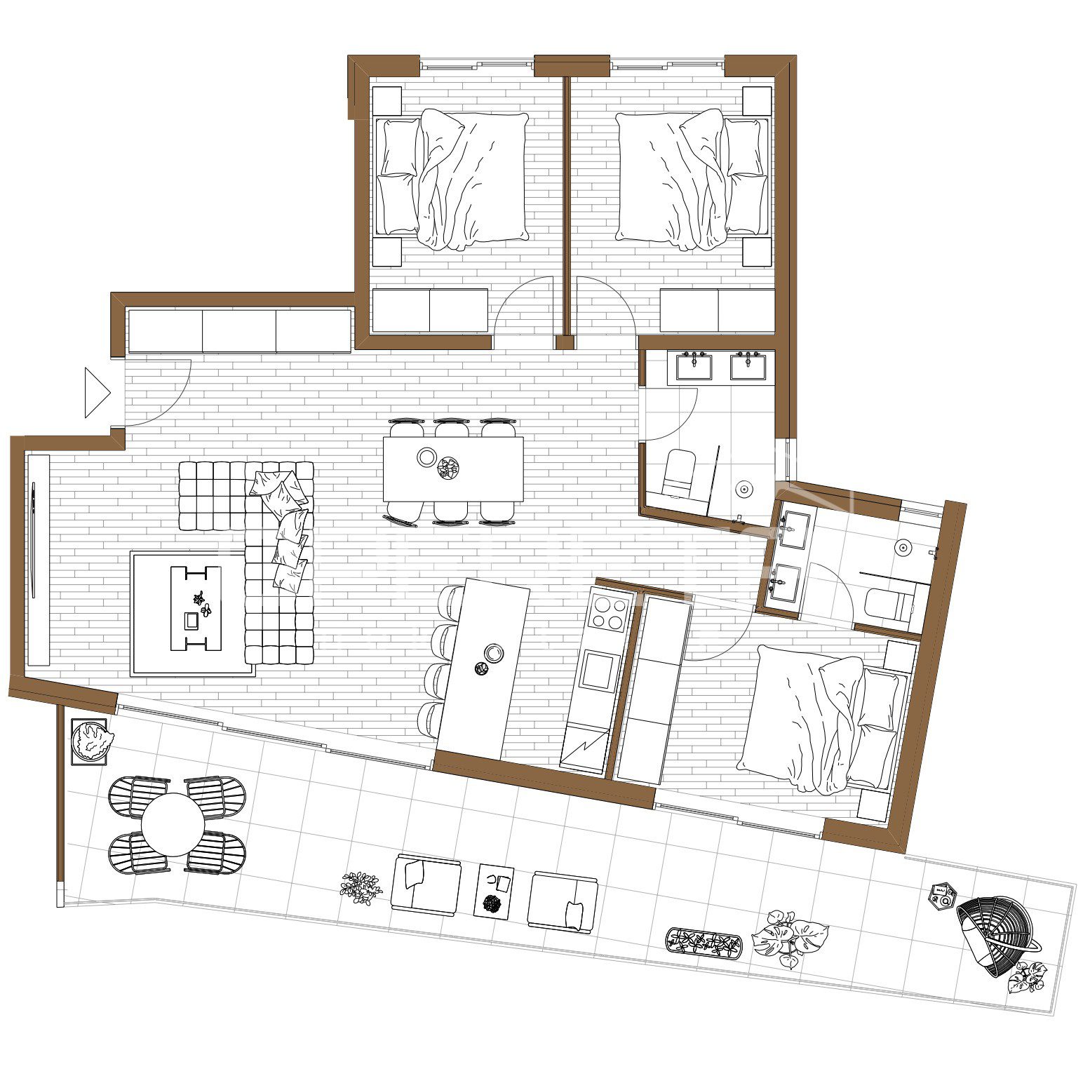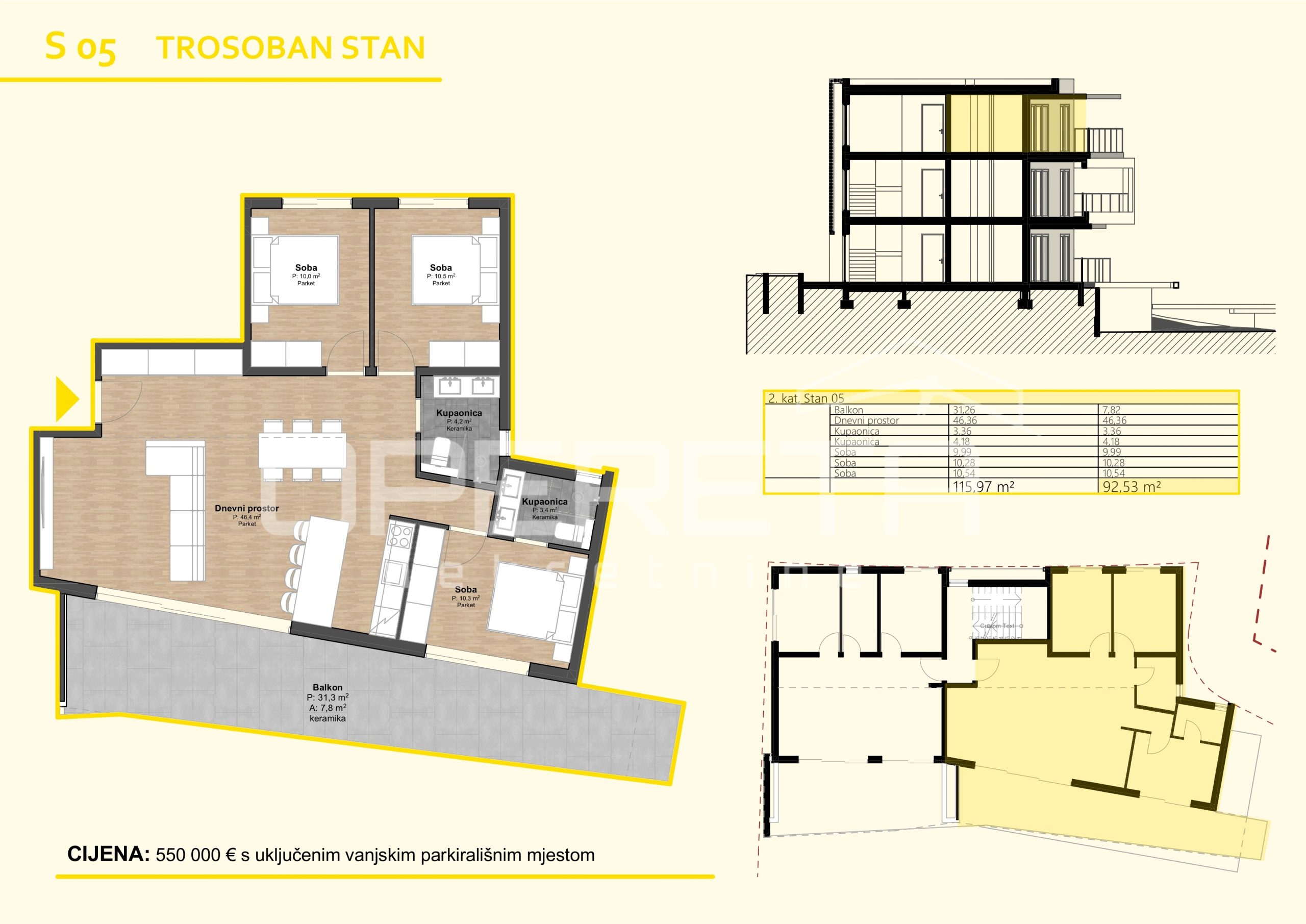 Stan se sastoji od prostranog dnevnog boravka s kuhinjom i blagovaonicom ukupne površine preko 45 m2, tri spavaće sobe, dvije kupaonice i terase veličine 31 m2. Uz stan dolazi jedno vanjsko parkirno mjesto.