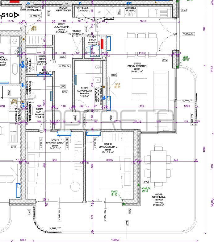 Stan S10 ima stambenu površinu od 97,40 m² i sastoji se od: