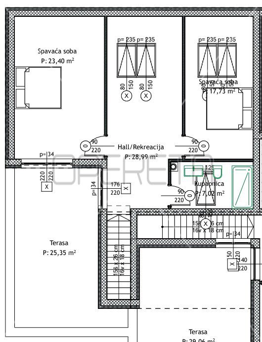 U potkrovlju se nalaze hodnik-rekreacija od 28,99 m², dvije spavaće sobe površina 23,40 m² i 17,73 m², kupaonica od 7,02 m², te terasa od 25,35 m².