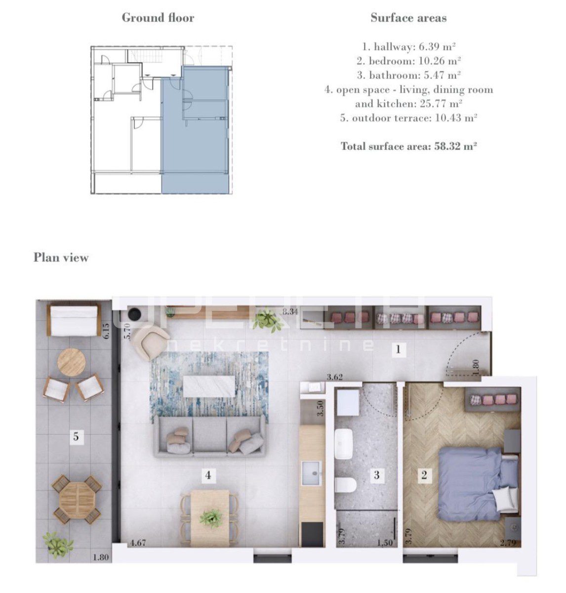 Stan se sastoji od ulaznog hodnika koji vodi do otvorenog dnevnog boravka s blagovaonicom, stvarajući prozračan i svijetao prostor. Posebna pogodnost je odvojena kuhinja s ostavom. Stan ima jednu spavaću sobu i modernu kupaonicu, a iz dnevnog boravka se izlazi na natkrivenu terasu, idealnu za uživanje u miru i svježem zraku.