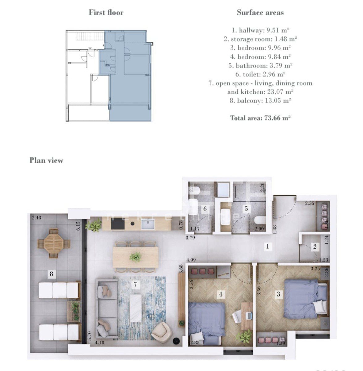 Stan se sastoji od ulaznog hodnika koji vodi do otvorenog dnevnog boravka s blagovaonicom, stvarajući prozračan i svijetao prostor. Posebna pogodnost je odvojena kuhinja s ostavom. Stan ima dvije spavaću sobu i modernu kupaonicu, a iz dnevnog boravka se izlazi na natkrivenu terasu, idealnu za uživanje u miru i svježem zraku.