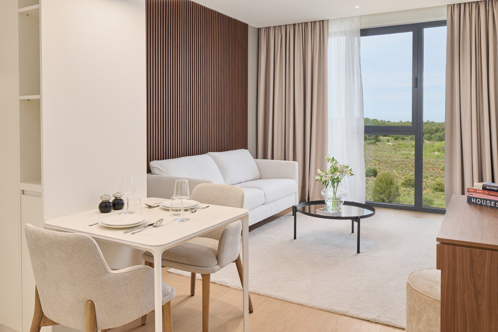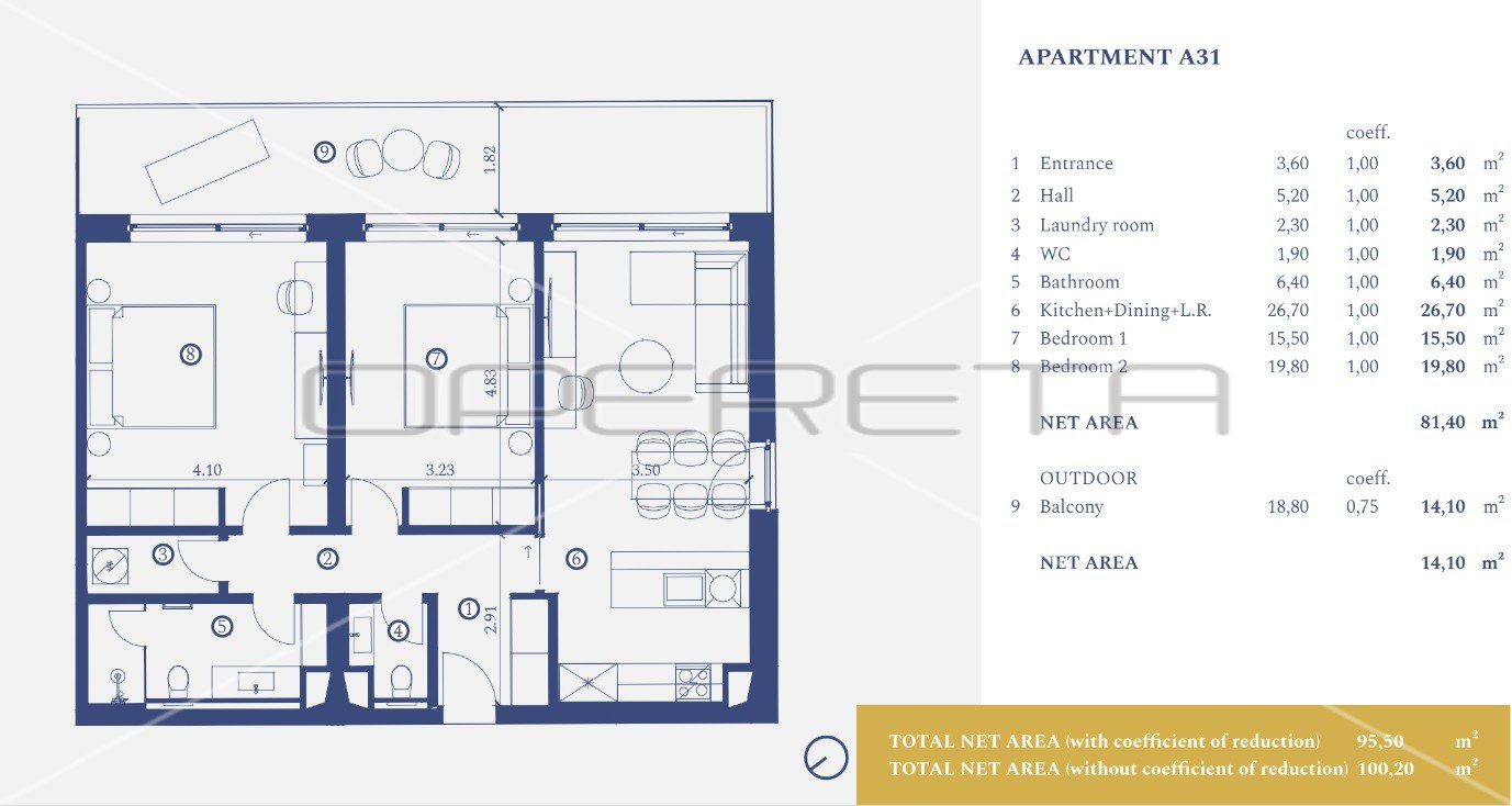 Manje od 200m udaljenosti od plaže unutar luksuznog resorta koji zadivljuje 100-metarskim bazenom na krovu aparthotela. Dizajnerski namještaj, pogled na more, blizina golf igrališta, spa centar, restorani, trgovine, bazeni unutar resorta, concierge usluga, itd. čine ovaj apartman neodoljivim. Jedinica A31 se nalazi na 2. katu, ukupne je neto površine 100,20 m2. Sastoji se od ulaza, hodnika, vešeraja, 2 kupaonice, WC-a, 2 spavaće sobe i open space dnevnog boravka sa kuhinjom i blagovaonicom. Također, ima i balkon površine 18,80 m2.