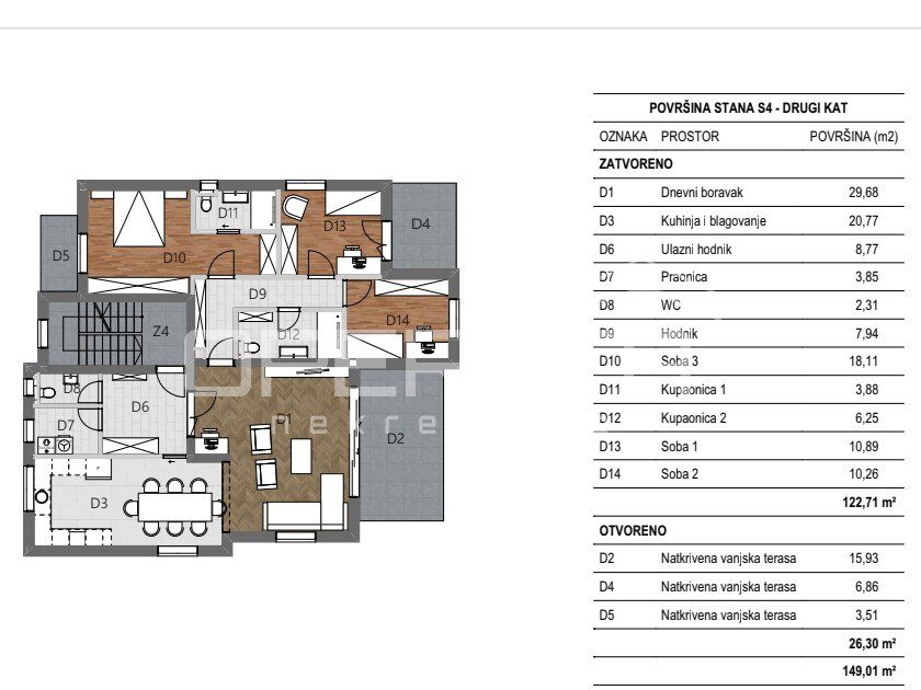 Penthouse S4 zauzima cijeli drugi kat zgrade, pružajući maksimalnu privatnost i udobnost. Na 122 m² stambene površine smještene su 3 spavaće sobe, dvije kupaonice, dodatni toalet, praonica te “open space” dnevni boravak i kuhinja s blagovaonicom. Dodatni komfor pružaju tri natkrivene terase ukupne površine 26,30 m² – dvije uz spavaće sobe i jedna uz dnevni boravak – savršene za opuštanje i boravak na otvorenom.