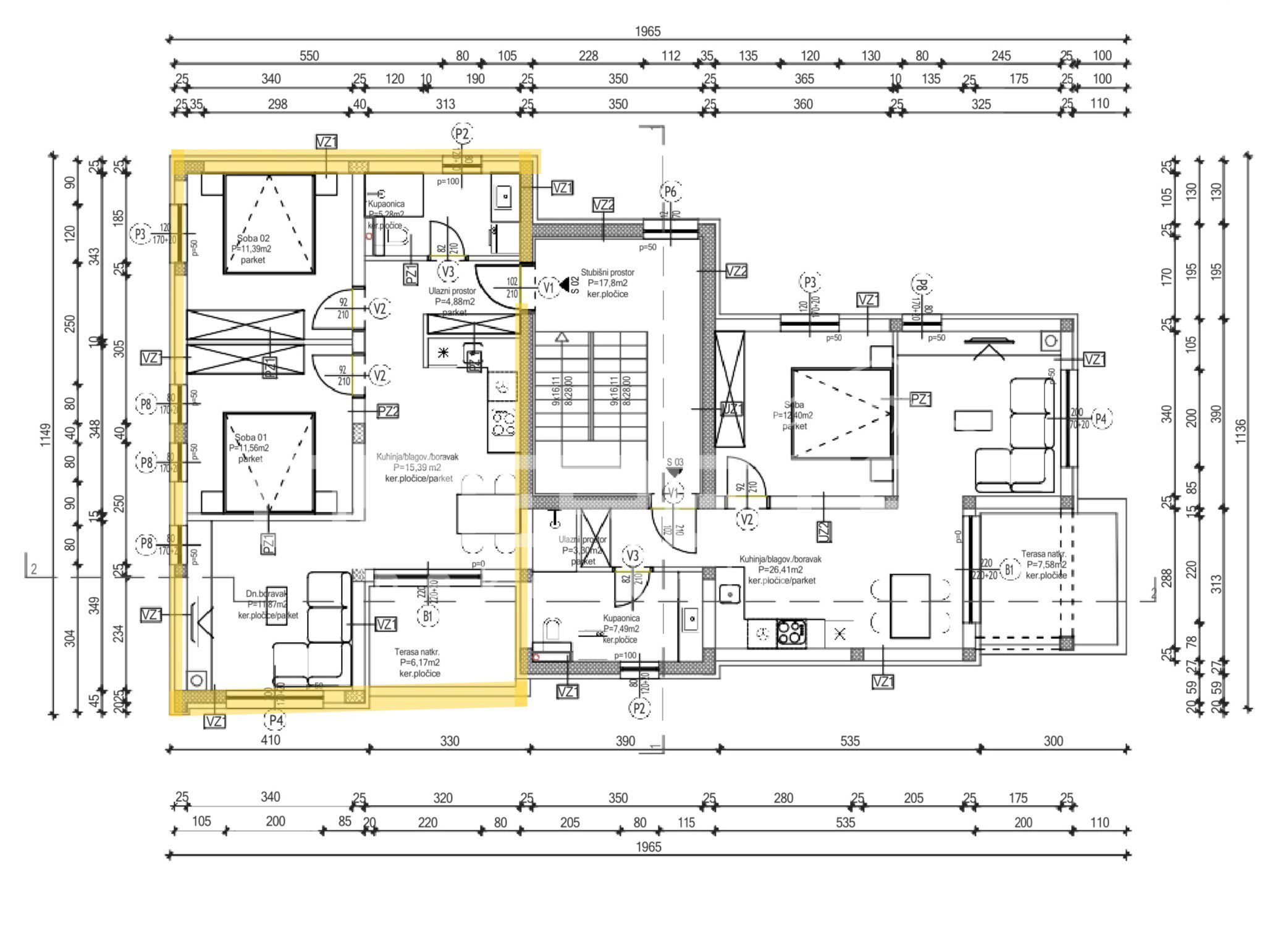 Na 1. katu zgrade smjestio se S2, površine 63,46 m², koji uključuje ulazni prostor, kupaonicu, 2 spavaće sobe, kuhinju s blagovaonicom, dnevni boravak te natkrivenu terasu. Stanu pripadaju dva parkirna mjesta, od kojih je jedno natkriveno te funkcionalno spremište u podrumu.