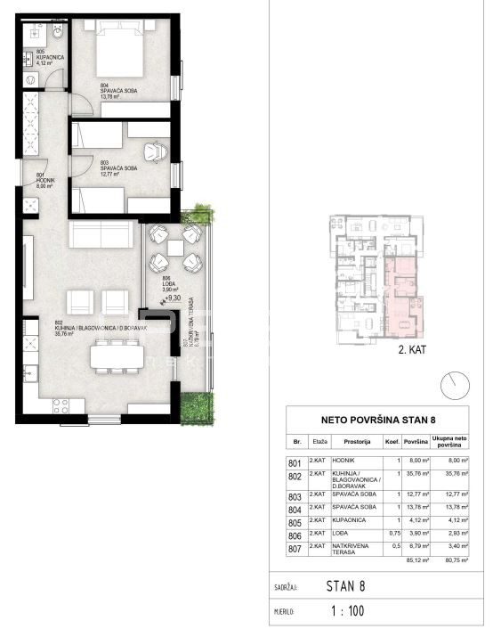 stan S8 n 2. katu, neto površine 80,75 m², s pažljivo osmišljenim rasporedom: dvije prostrane spavaće sobe, prostrani dnevni boravak, kuhinja s blagovaonicom, kupaonica, hodnik, lođa te natkrivena terasa za uživanje u pogledu i miru.