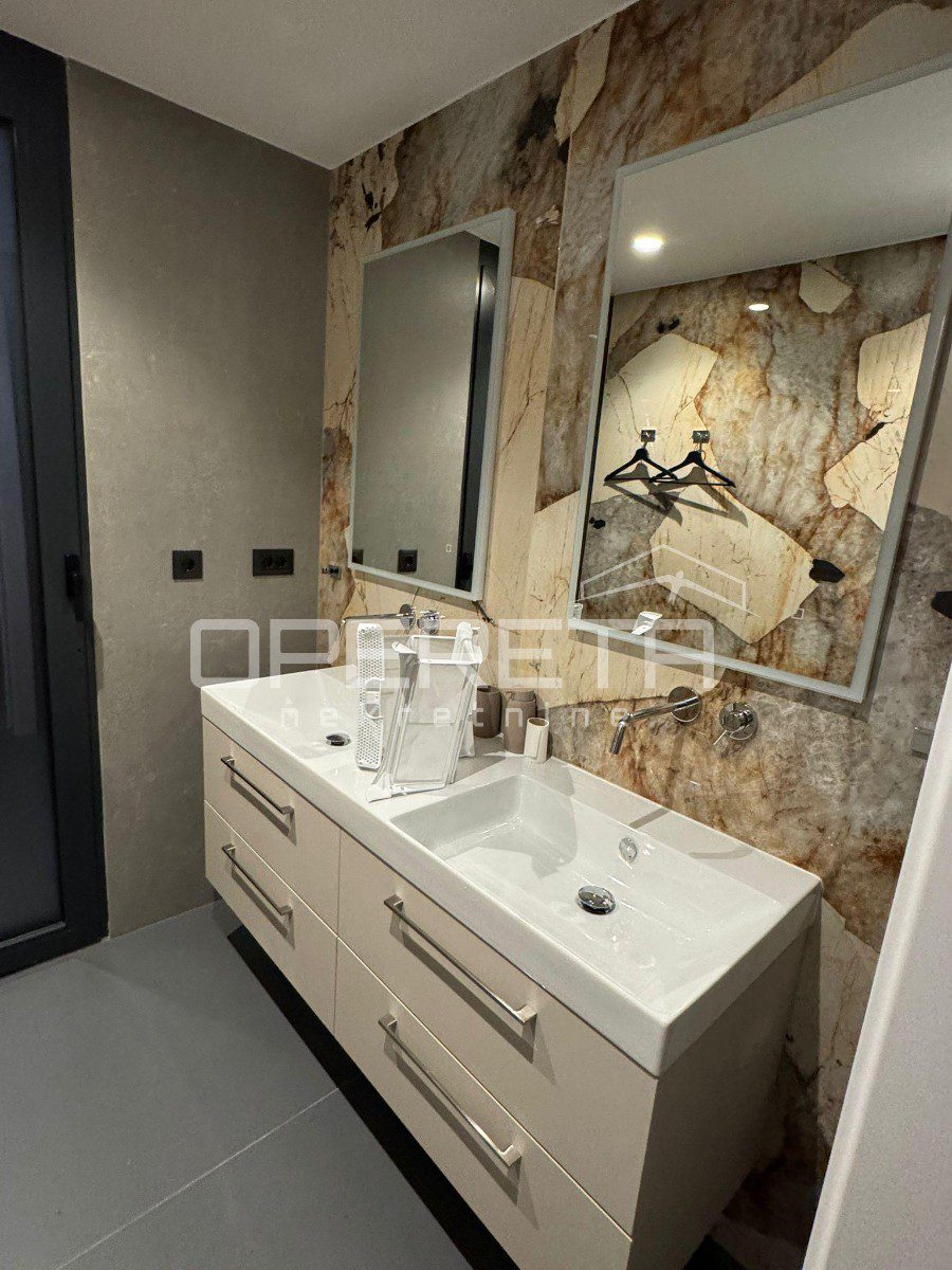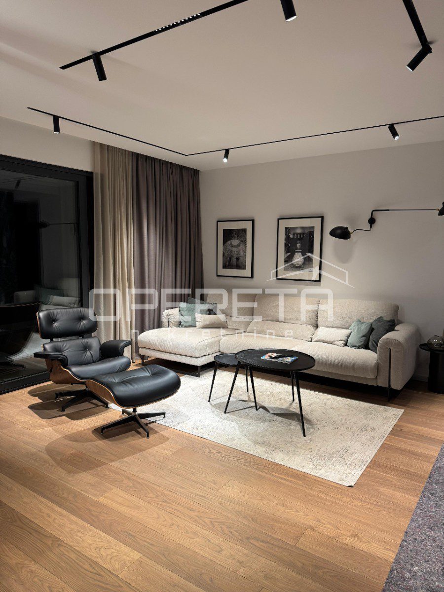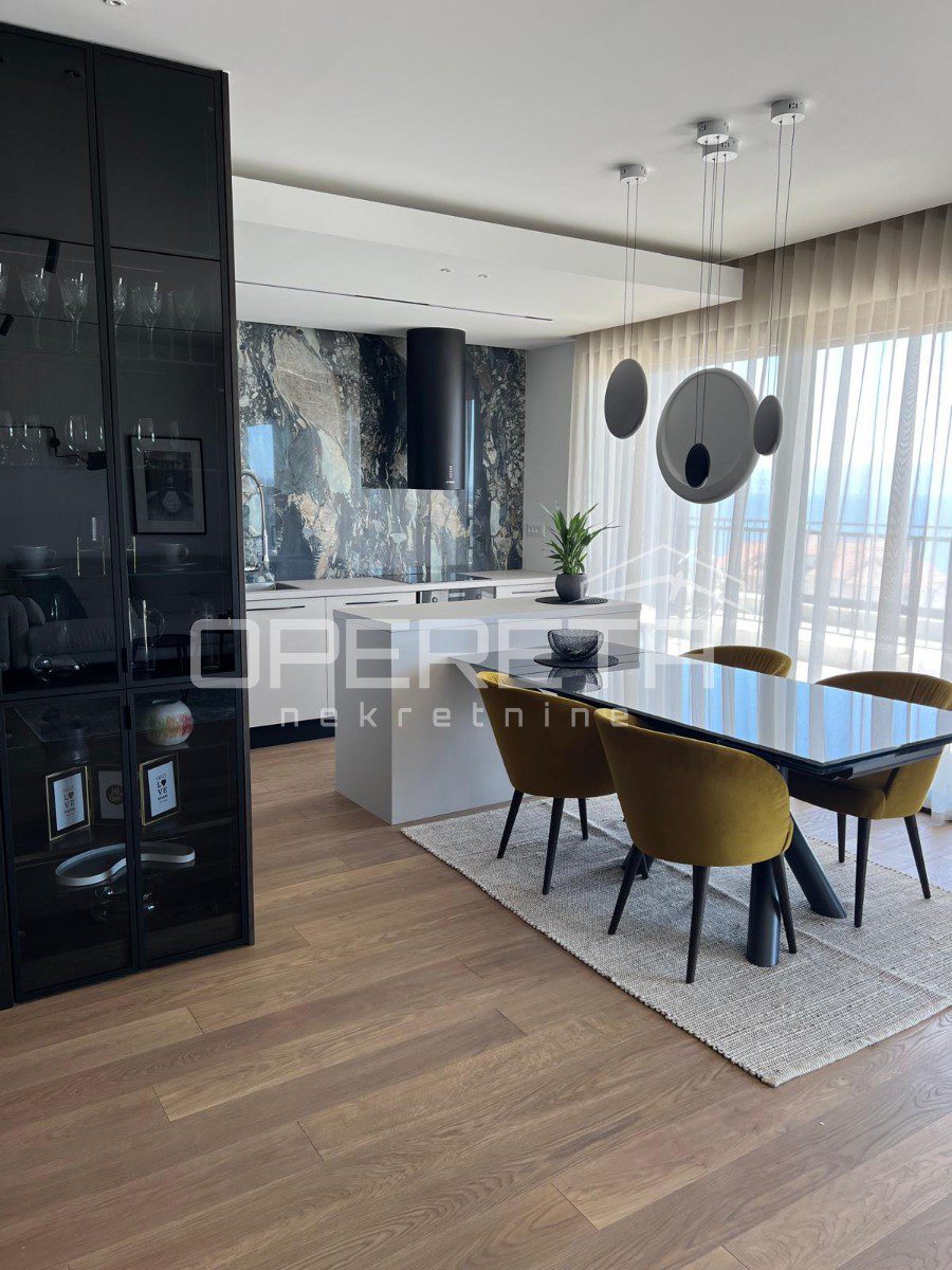 Ukupna stambena površina iznosi 100 m², a raspored je pažljivo osmišljen kako bi spojio funkcionalnost i eleganciju. Prostrani dnevni boravak prirodno se nastavlja na kuhinju i blagovaonicu, stvarajući skladan prostor za svakodnevni život i druženja. Stan raspolaže s tri udobne spavaće sobe i moderno uređenim kupaonicama, a svaki detalj interijera odabran je s naglaskom na kvalitetu, estetiku i dugotrajnost.