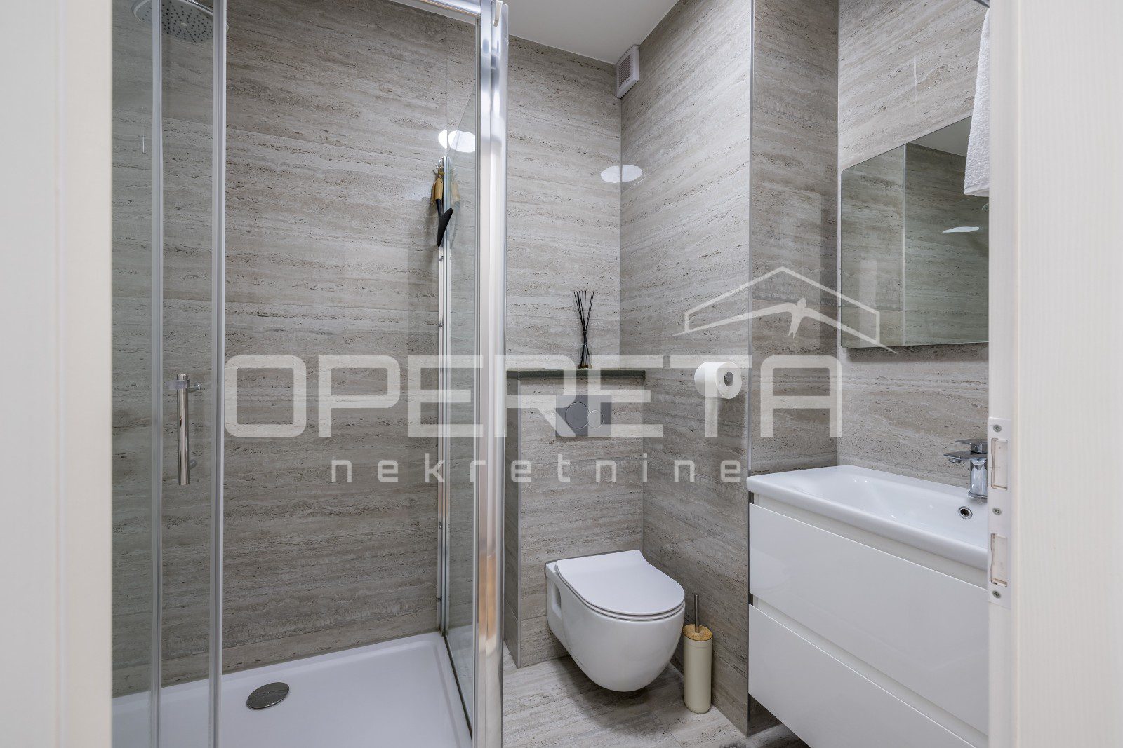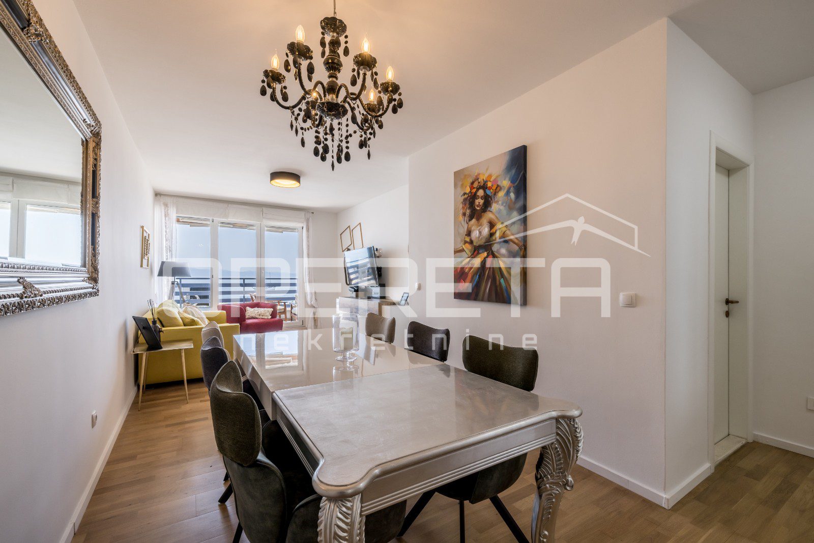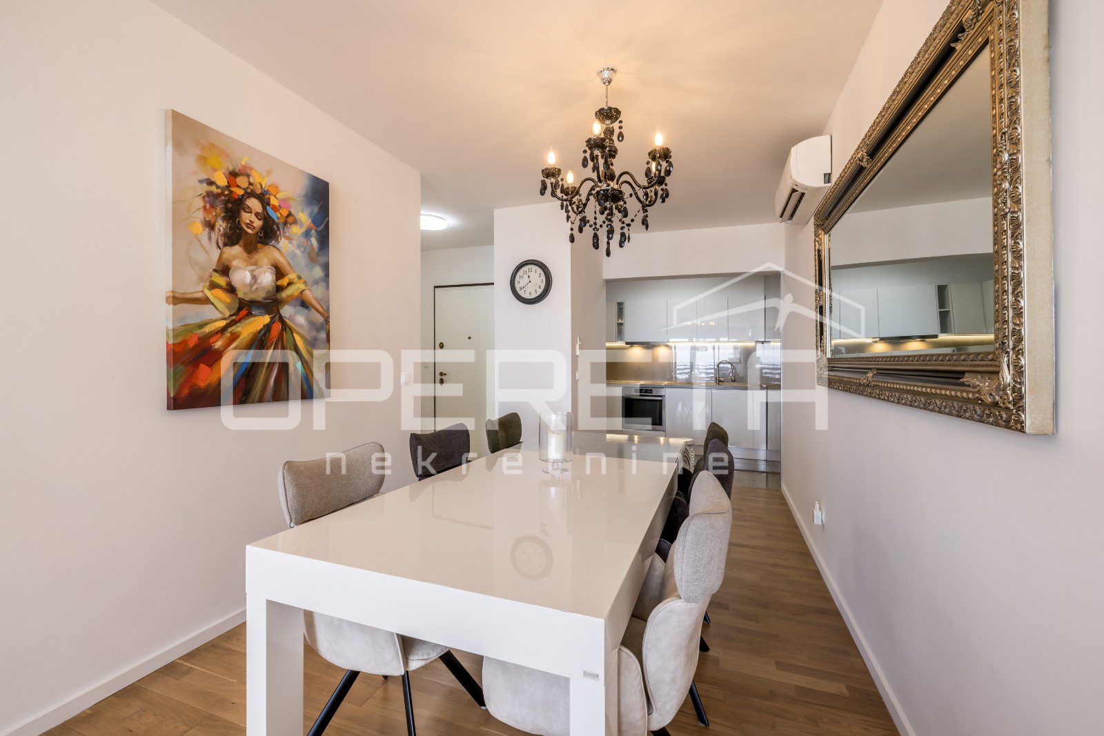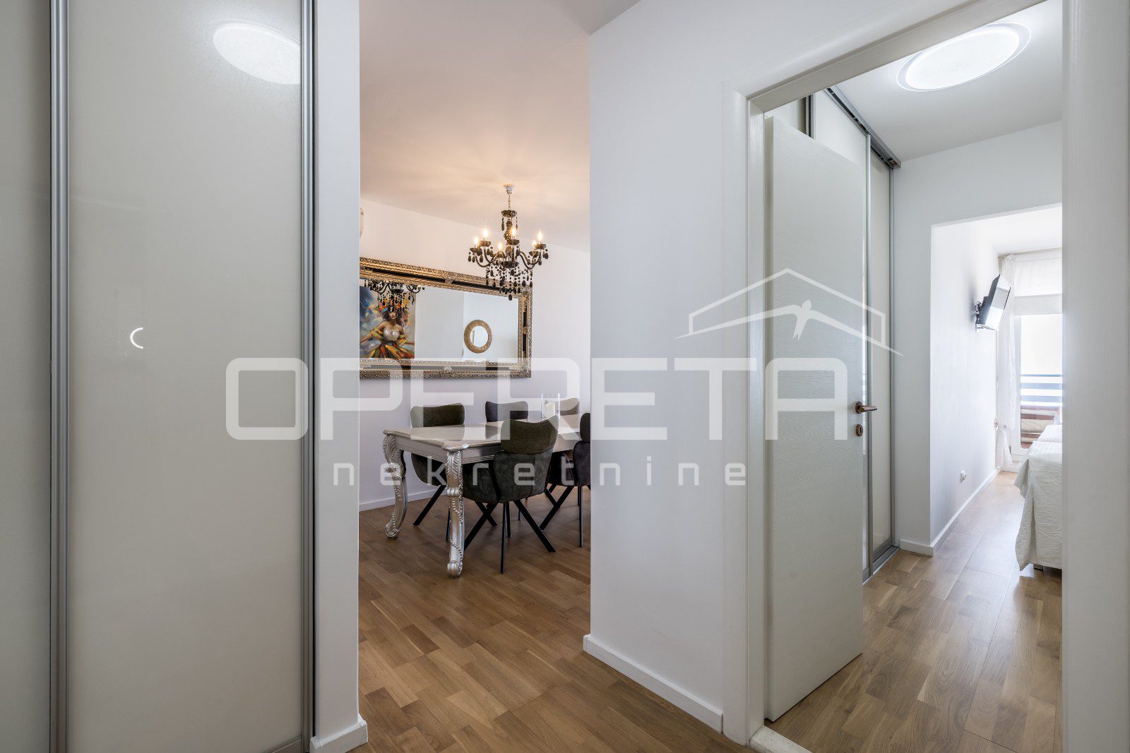 Stan je potpuno namješten i opremljen modernim uređajima i kvalitetnim materijalima, a pažljivo osmišljeni detalji stvaraju toplu i ugodnu atmosferu. Južna orijentacija osigurava obilje prirodnog svjetla tijekom cijelog dana. Uz stan dolazi i pripadajuće garažno parkirno mjesto površine 18 m² u zatvorenoj garaži, što dodatno doprinosi praktičnosti i sigurnosti.