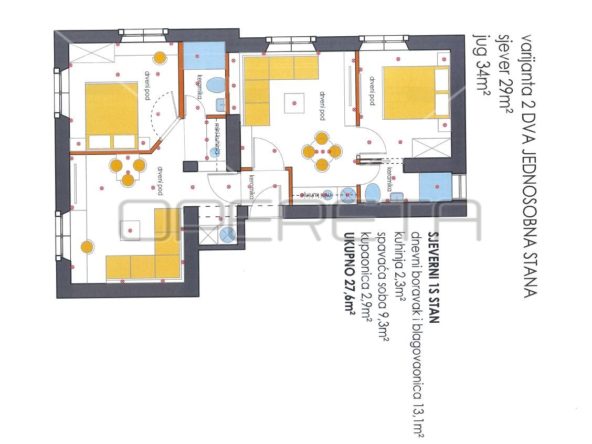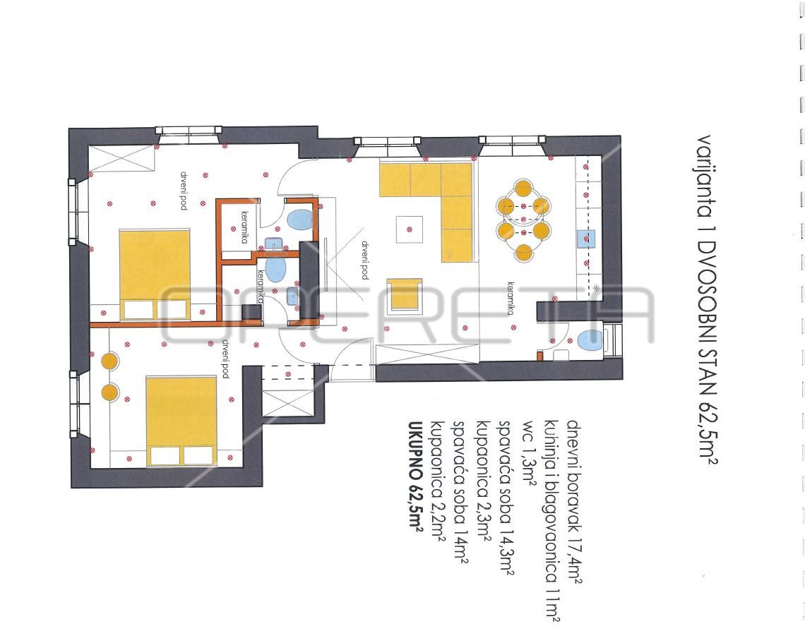 Ukupna površina stana iznosi 66,38 m² i sastoji se od tri spavaće sobe, kuhinje i blagovaonice s pripadajućom random spremom, izbe, kupaonice s toaletom te velikog i prostranog predsoblja. Stanu pripada i odvojena drvarnica površine 2,5 m².