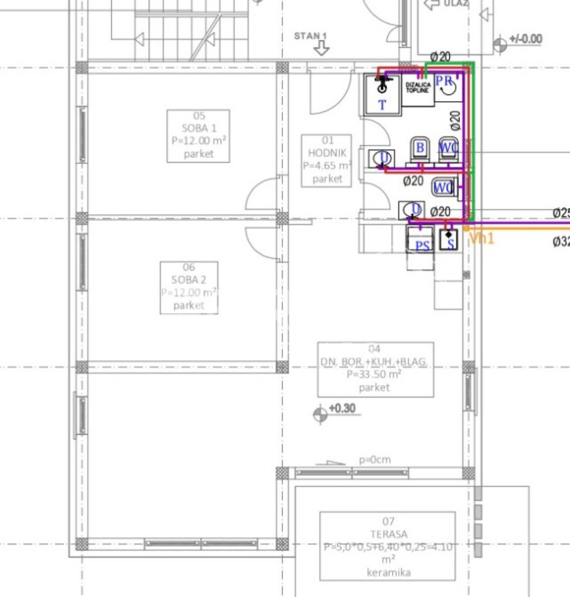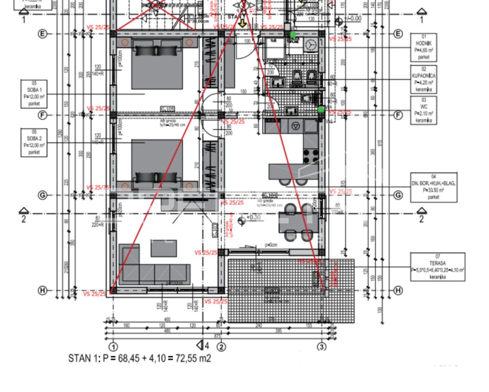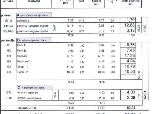 Stan u prizemlju zgrade, u naravi 68,5m2 unutarnjeg zatvorenog prostora, se sastoji od ulaznog prostora, 2 prostrane spavaće sobe, kupaonice sa wc-om, dodatnog, zasebnog wc-a, otvorenog dnevnog boravka sa kuhinjom i blagovaonicom sa izlazom na terasu (11m2).