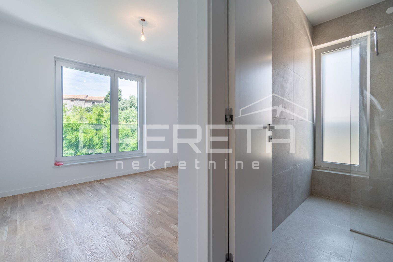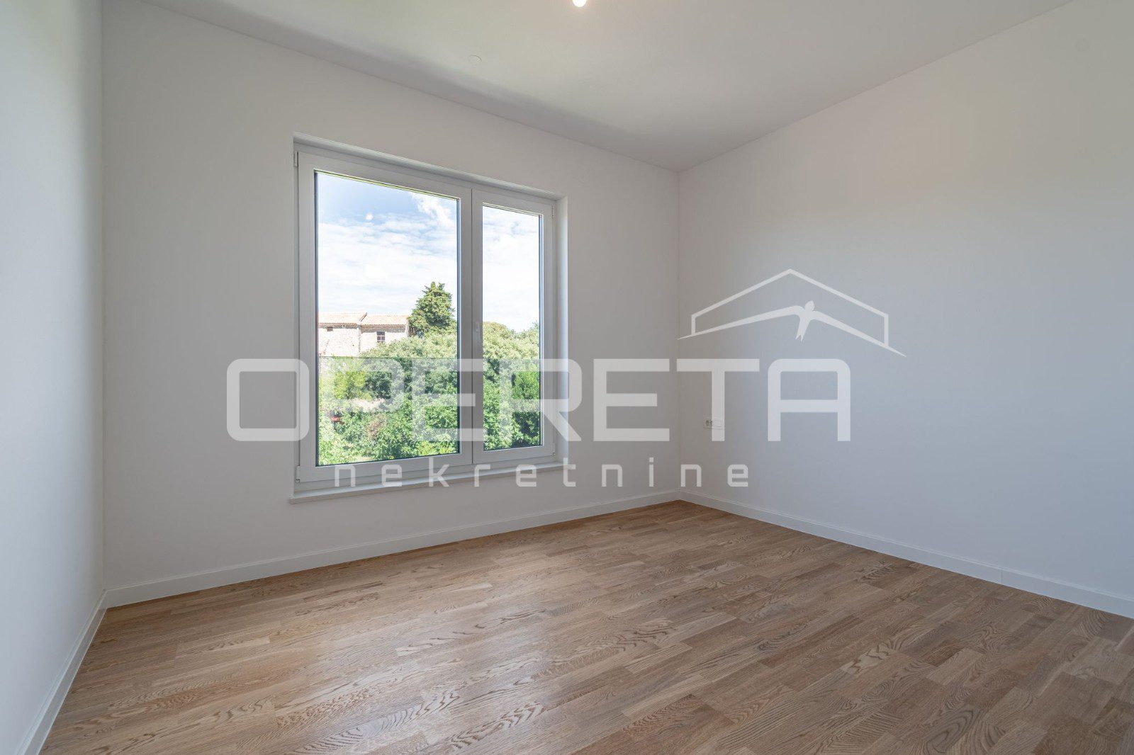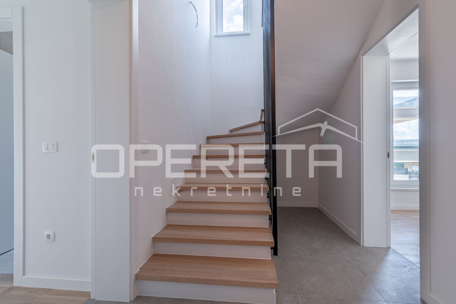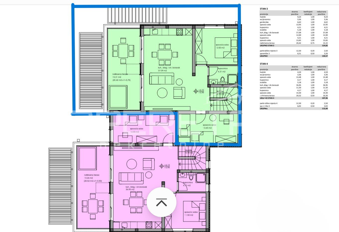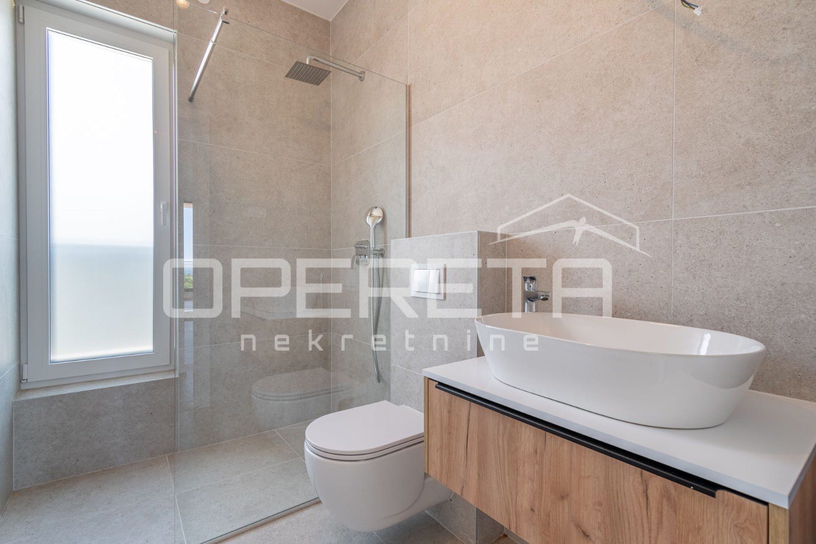 Donja etaža stana sastoji se od elegantnog predsoblja, jedne spavaće sobe s vlastitom kupaonicom, garderobe te praktične praonice s toaletom. Unutarnje stepenište vodi na gornju etažu, gdje dominira prostrani dnevni boravak s kuhinjom i blagovaonicom u otvorenom konceptu. Na istoj etaži nalaze se još dvije spavaće sobe i dvije kupaonice, čime se osigurava maksimalna privatnost za sve stanare. Iz dnevnog dijela izlazi se na natkrivenu terasu površine 15 m² s koje se pruža očaravajući, otvoren pogled na more, idealan za trenutke opuštanja.