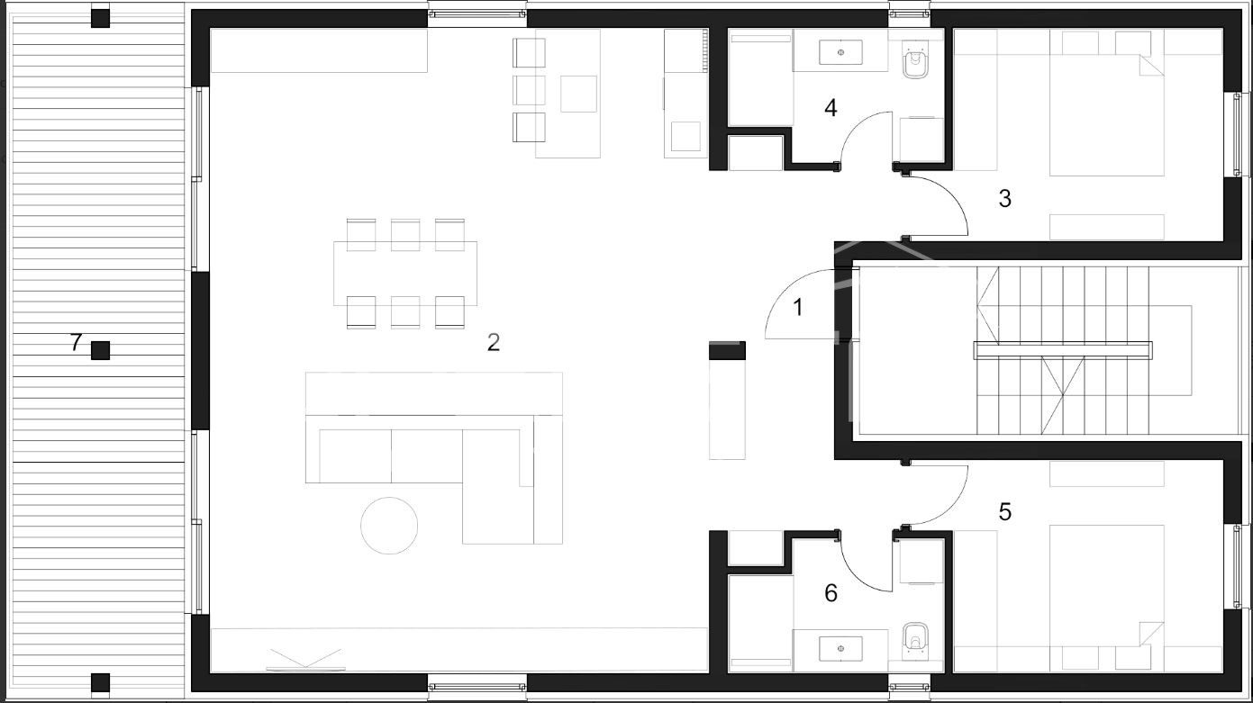 Glavni dio stana čini prostrani dnevni boravak s integriranom blagovaonicom i kuhinjom, koji postaje središte obiteljskog života i druženja.