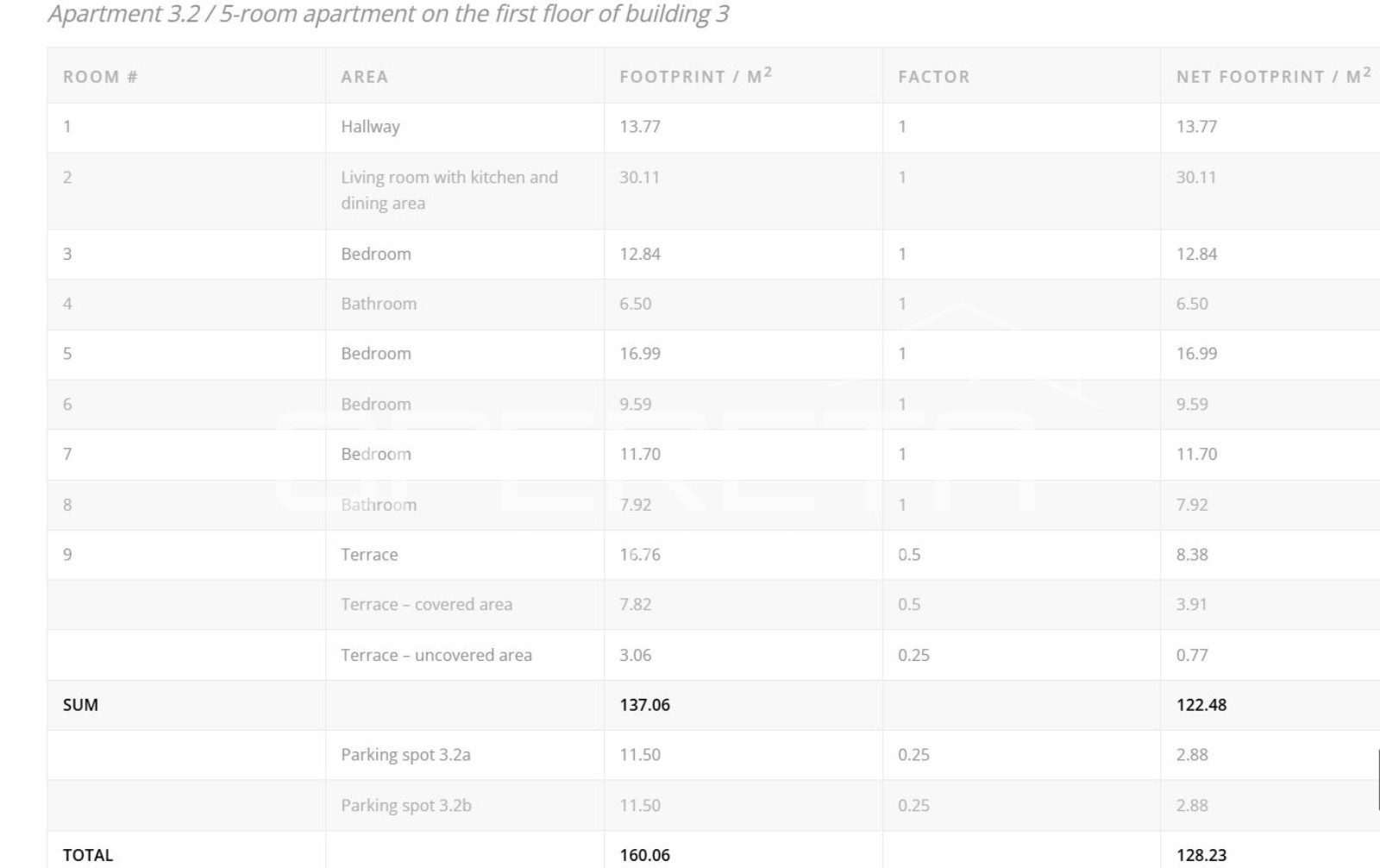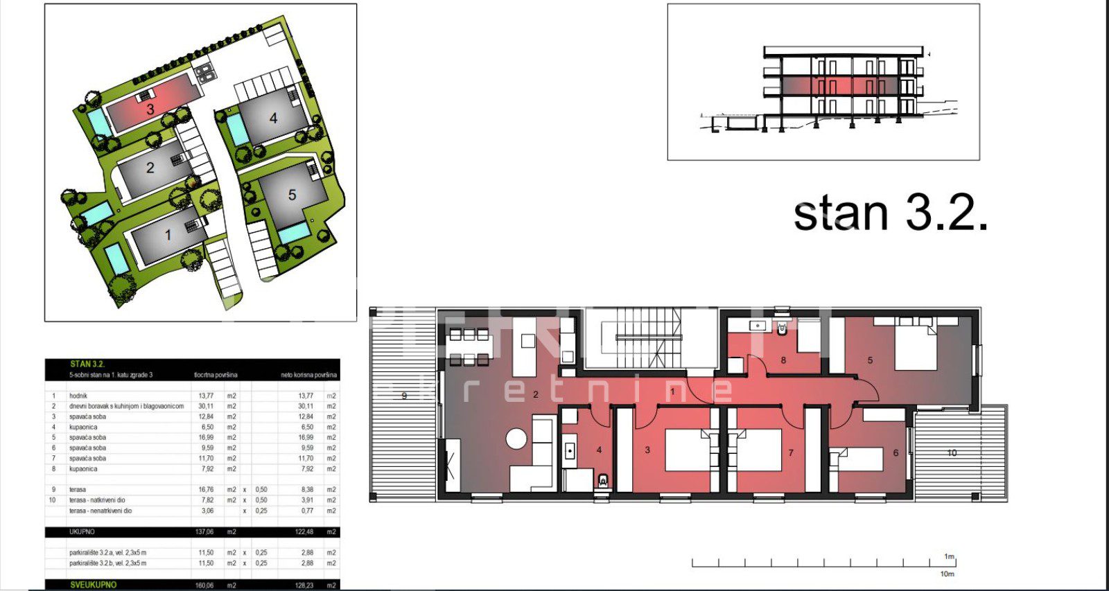 Stan ukupne neto površine 128,23 m2 sastoji se od četiri velike spavaće sobe koje jamče miran i udoban san, dok su dvije kupaonice s toaletom opremljene suvremenim elementima za svakodnevnu udobnost i praktičnost.