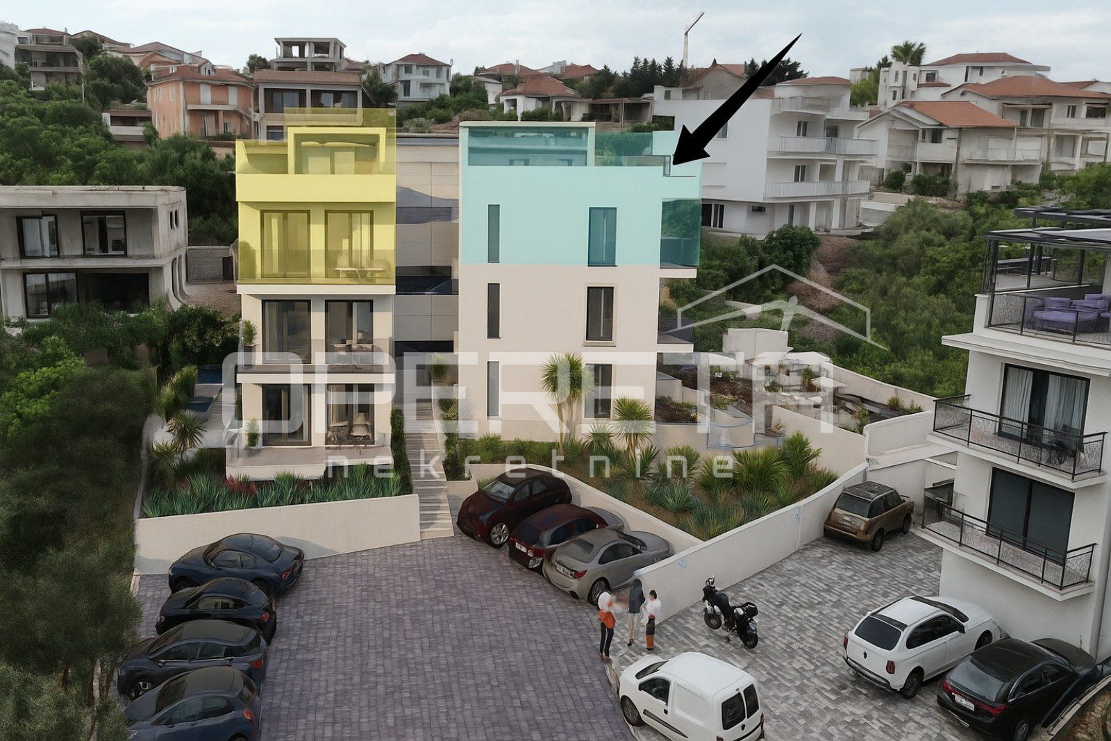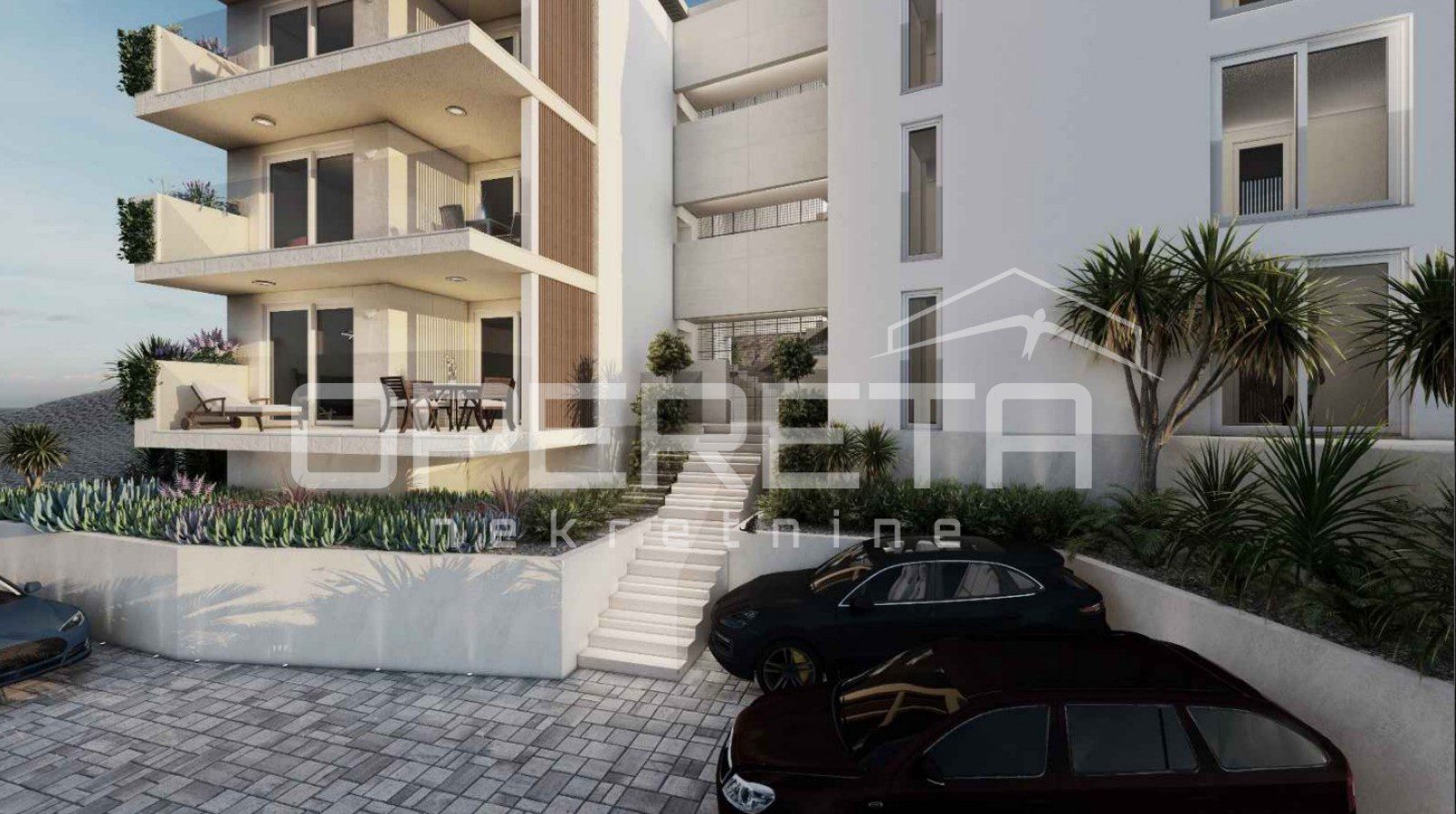 U samom centru Okruga Gornjeg, na mirnoj poziciji bez prometa glavne ceste i na nekoliko minuta hoda do plaže i svakodnevnih sadržaja, nalazi se dvoetažni trosobni penthouse na drugom katu novogradnje. Položaj na vrhu zgrade donosi privatnost i neometan pogled jer iznad nema stanara.