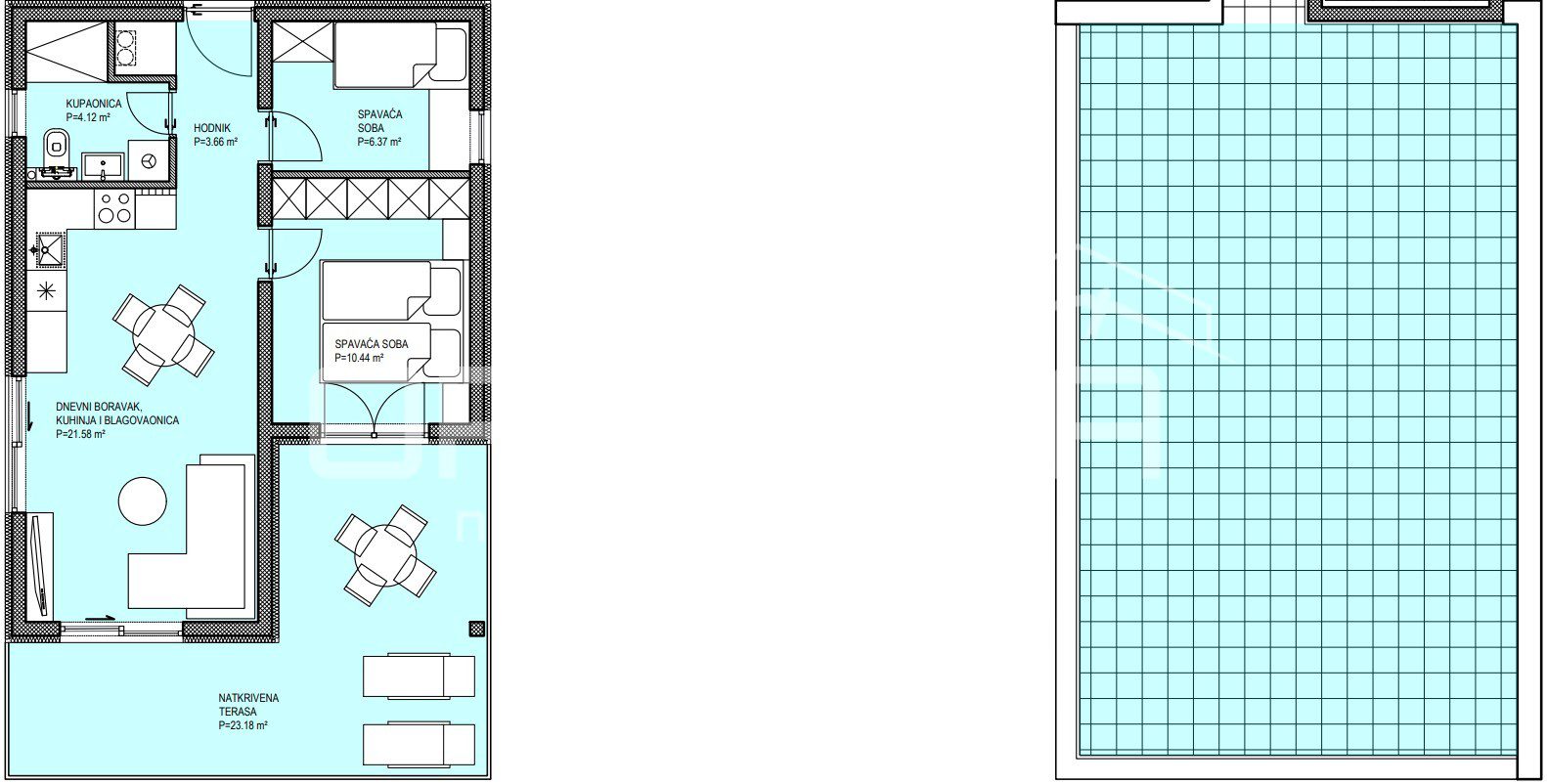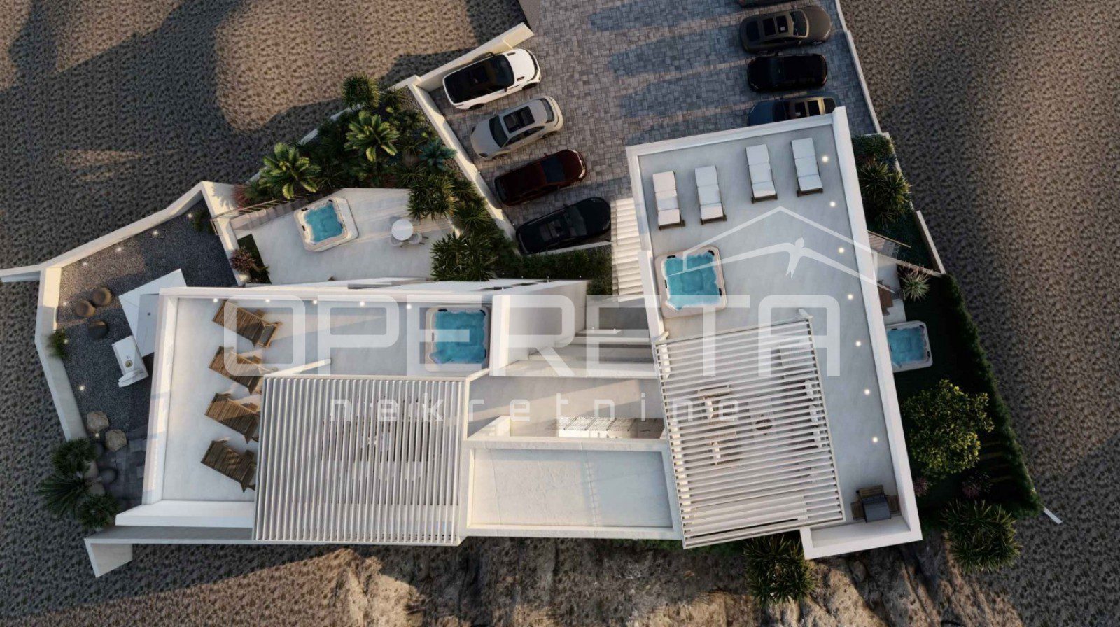 Krovna terasa je ravan, prohodan krov s instalacijama vode i struje, spreman za ljetnu kuhinju, lounge zonu i sunčalište. Čelične ograde osiguravaju trajnost i sigurnost. Pogled na more je širok i trajan, pogodan za cjelodnevno korištenje vanjskog prostora.