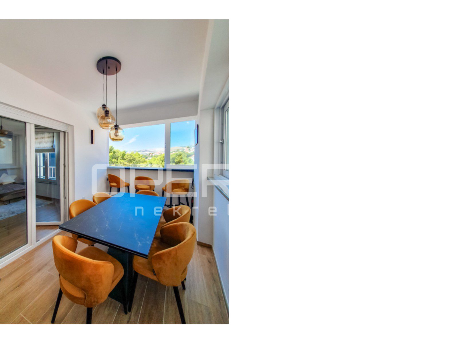 Prostrani dnevni boravak povezan je s moderno opremljenom kuhinjom i ostakljenom lođom, pretvorenom u dodatni kutak za blagovanje. a zahvaljujući kliznim stijenama, uživanje na njoj je moguće bez obzira na vremenske uvjete. Iz dnevnog prostora i lođe pruža se predivan pogled na more i raskošno zelenilo.