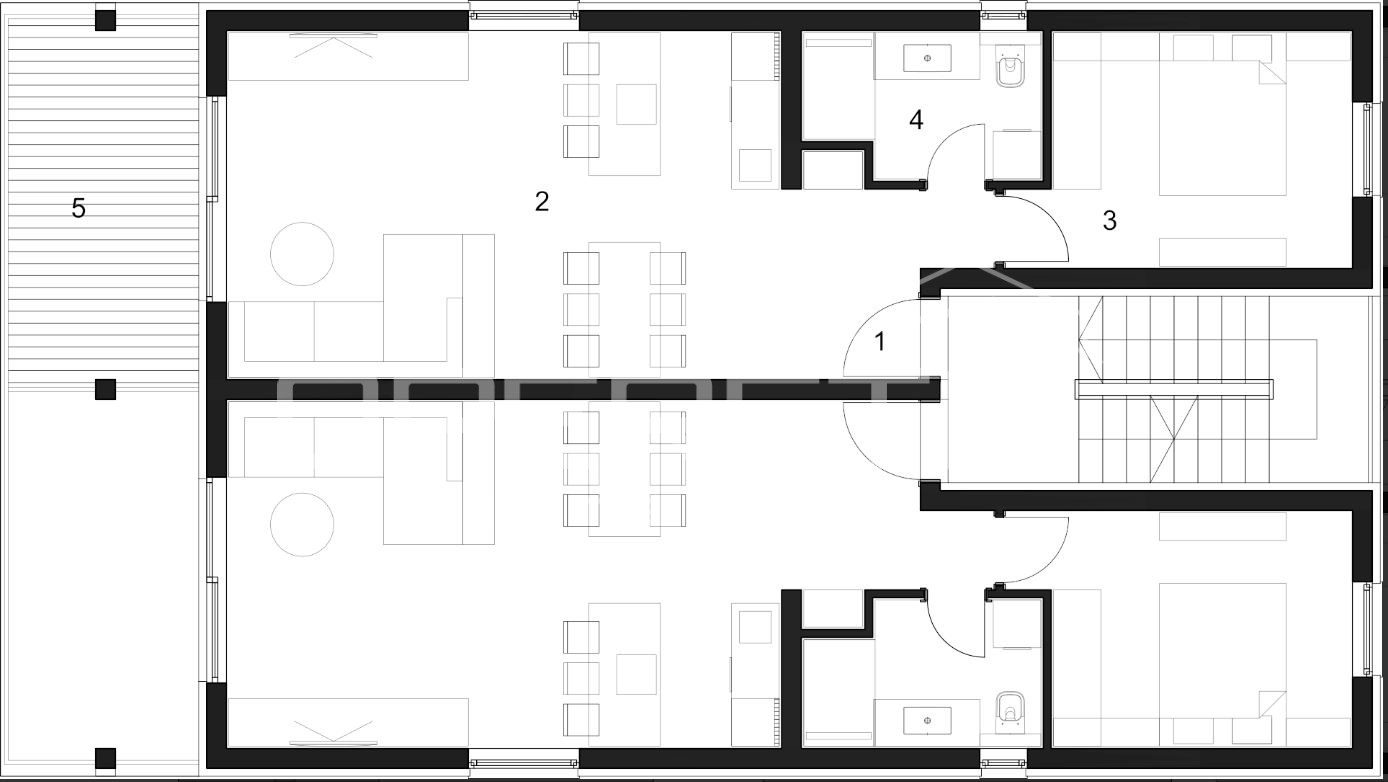 Prozori od poda do stropa povezuju interijer s eksterijerom, otvarajući pogled i pristup terasi koja nudi dodatni prostor za opuštanje ili zabavu.