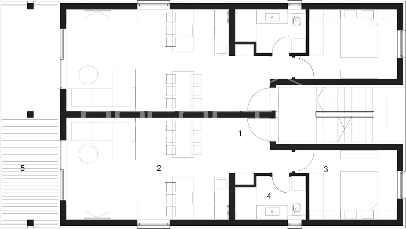 Prozori od poda do stropa povezuju interijer s eksterijerom, otvarajući pogled i pristup terasi koja nudi dodatni prostor za opuštanje ili zabavu.