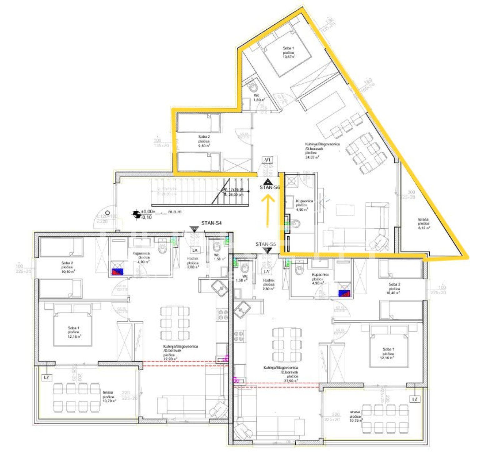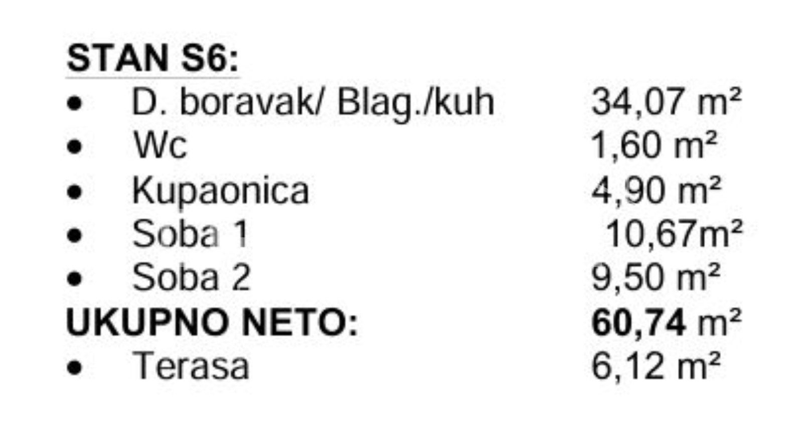 Stan S6 smješten je u prizemlju i prostire se na 60,74m² pažljivo osmišljenog prostora koji uključuje: hodnik, wc, kupaonicu, prostran dnevni boravak povezan s kuhinjom, 2 spavaće sobe te terasu površine 6,12m2 (koef. 0,50=3,06m2) za opuštanje.