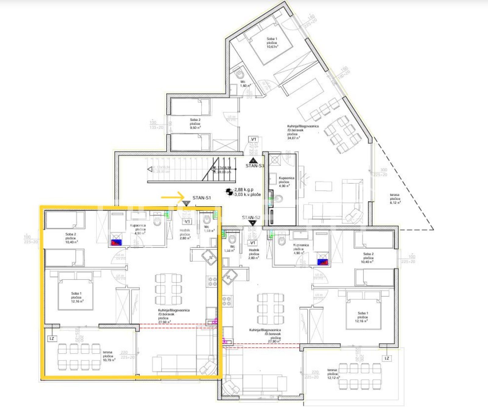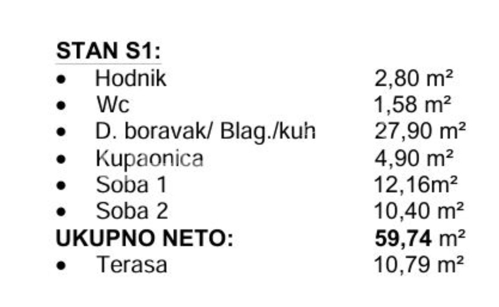 Stan S1 smješten je u prizemlju i prostire se na 59,74m² pažljivo osmišljenog prostora koji uključuje: hodnik, wc, kupaonicu, prostran dnevni boravak povezan s kuhinjom, 2 spavaće sobe te terasu površine 10,79m2 (koef. 0,50=5,39m2) za opuštanje.