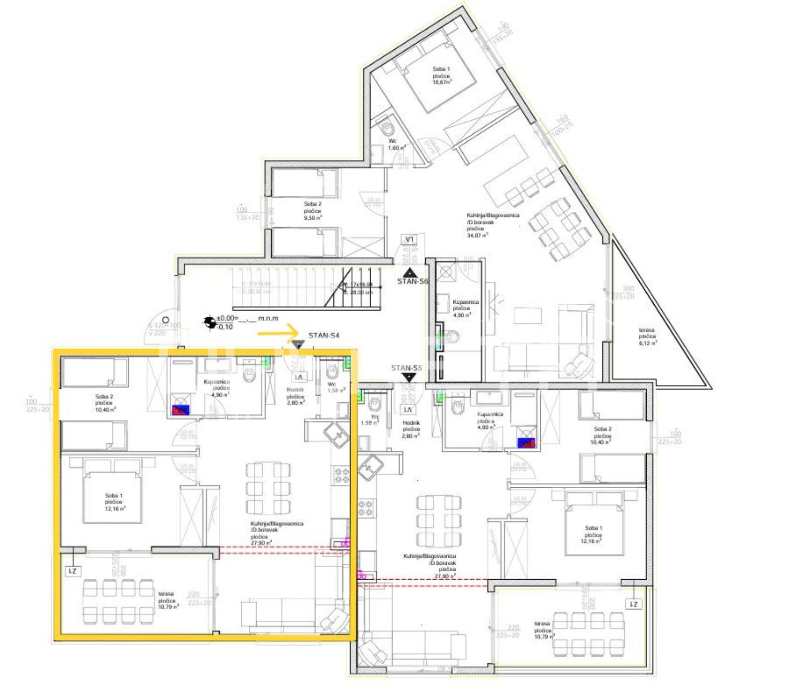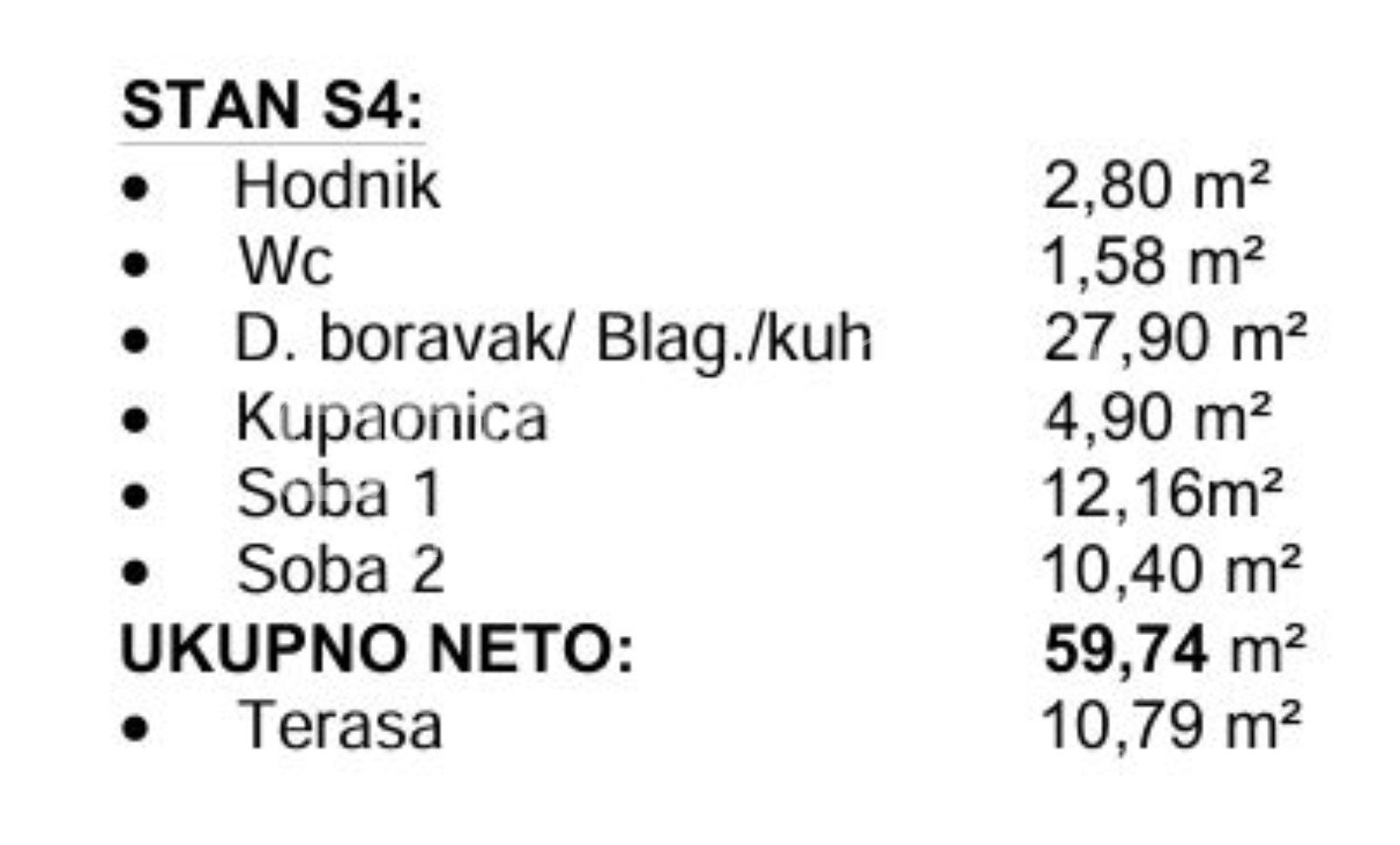 Stan S4 smješten je u prizemlju i prostire se na 59,74m² pažljivo osmišljenog prostora koji uključuje: hodnik, wc, kupaonicu, prostran dnevni boravak povezan s kuhinjom, 2 spavaće sobe te terasu površine 10,79m2 (koef. 0,50=5,39m2) za opuštanje.