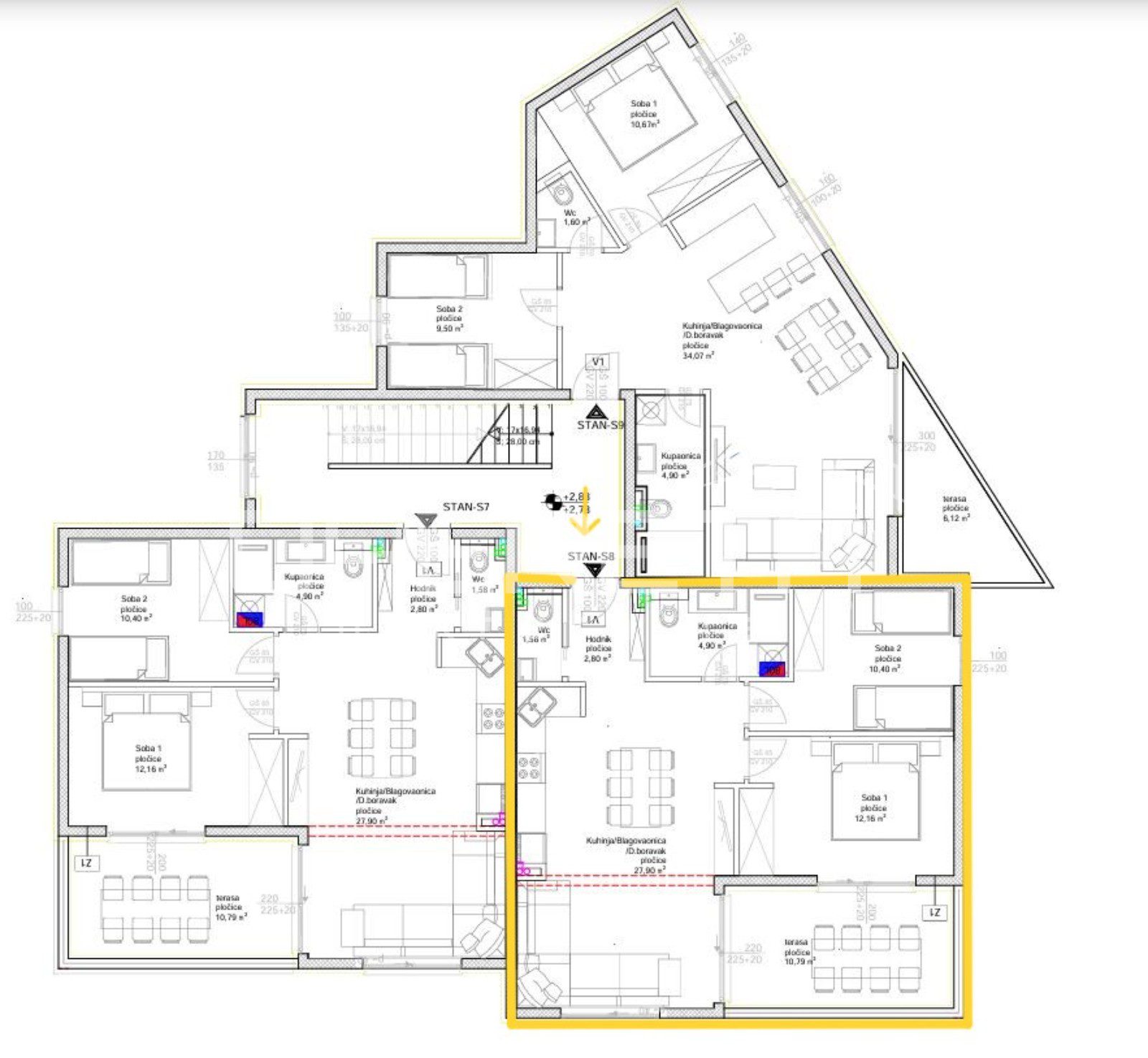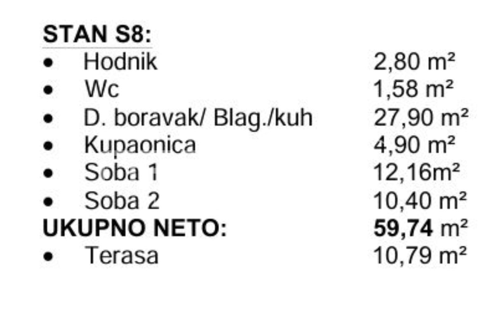 Stan S8 smješten je na 1. katu i prostire se na 59,74m² pažljivo osmišljenog prostora koji uključuje: hodnik, wc, kupaonicu, prostran dnevni boravak povezan s kuhinjom, 2 spavaće sobe te terasu površine 10,79m2 (koef. 0,50=5,39m2) za opuštanje.