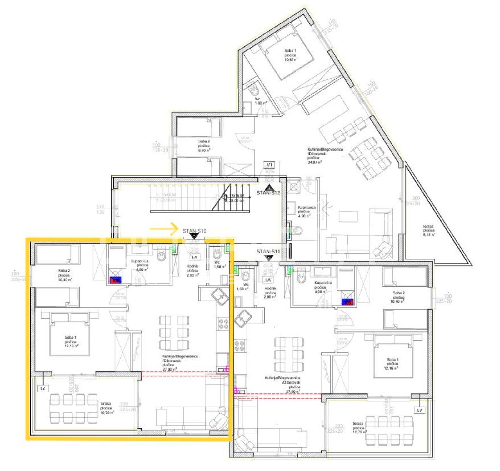 Stan S10 smješten je na 2. katu i prostire se na 59,74m² pažljivo osmišljenog prostora koji uključuje: hodnik, wc, kupaonicu, prostran dnevni boravak povezan s kuhinjom, 2 spavaće sobe te terasu površine 10,79m2 (koef. 0,50=5,39m2), krovna terasa 71,59 (koef.0,25=17,90) za opuštanje.