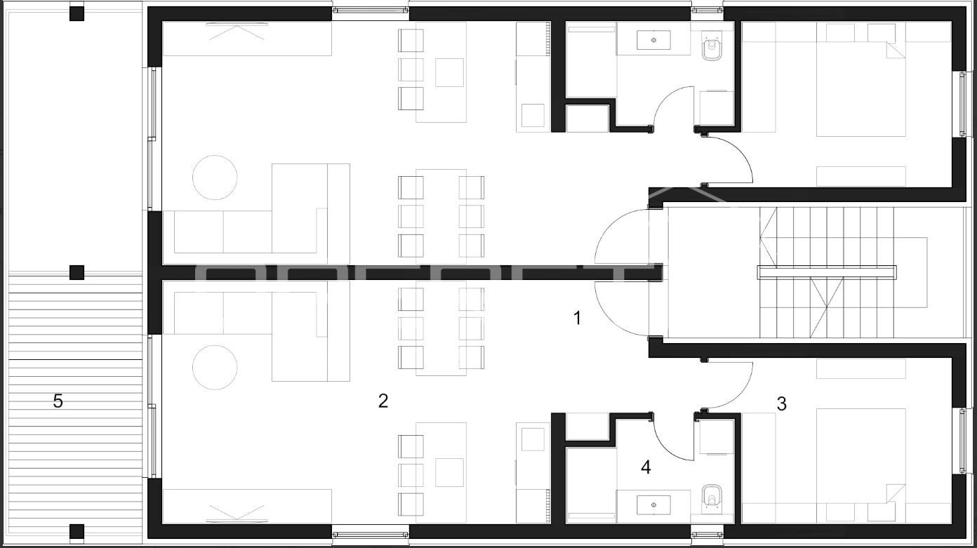 Prozori od poda do stropa povezuju interijer s eksterijerom, otvarajući pogled i pristup terasi koja nudi dodatni prostor za opuštanje ili zabavu.