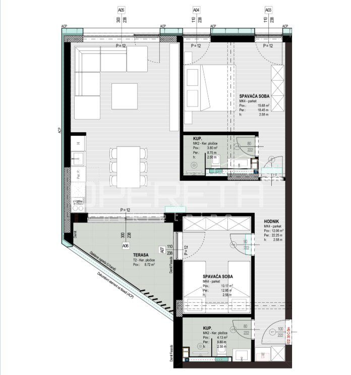 Podne obloge uključuju keramiku velikog formata i visokokvalitetni parket, dok je vanjska stolarija izrađena od aluminija (Wicona Wicslide 160) s troslojnim staklom, UV zaštitom i plinskim punjenjem, što osigurava vrhunsku izolaciju i dugotrajnost.