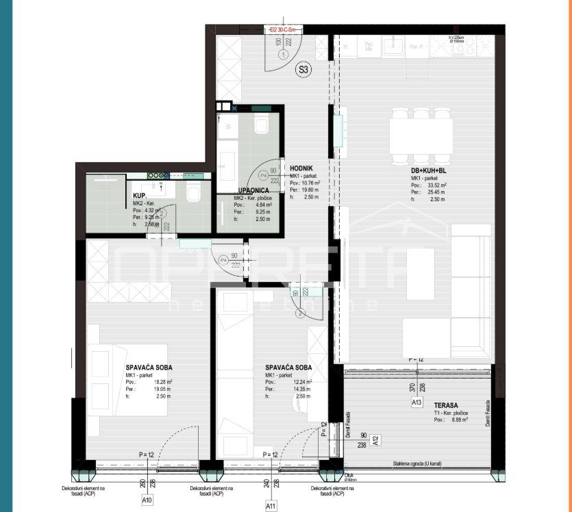 Podne obloge uključuju keramiku velikog formata i visokokvalitetni parket, dok je vanjska stolarija izrađena od aluminija (Wicona Wicslide 160) s troslojnim staklom, UV zaštitom i plinskim punjenjem, što osigurava vrhunsku izolaciju i dugotrajnost.