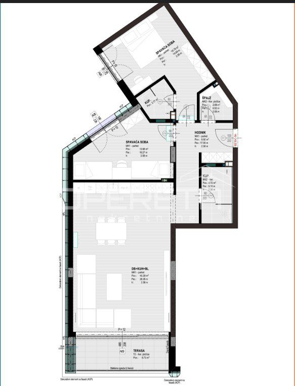 Podne obloge uključuju keramiku velikog formata i visokokvalitetni parket, dok je vanjska stolarija izrađena od aluminija (Wicona Wicslide 160) s troslojnim staklom, UV zaštitom i plinskim punjenjem, što osigurava vrhunsku izolaciju i dugotrajnost.