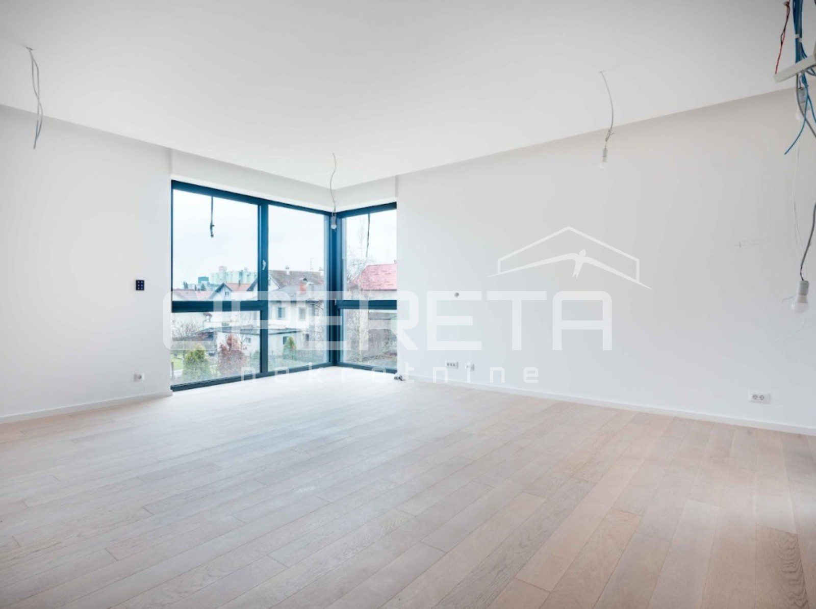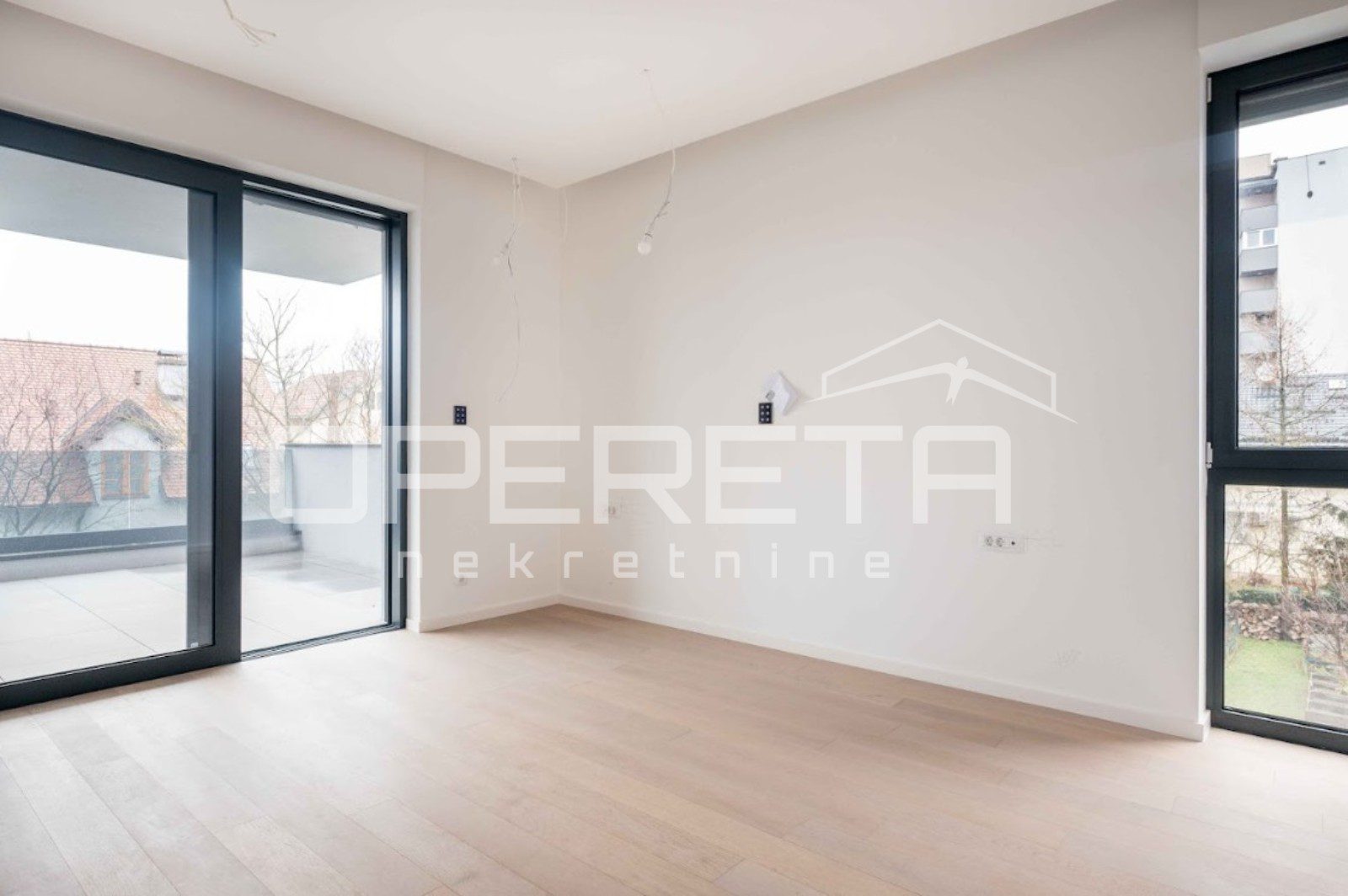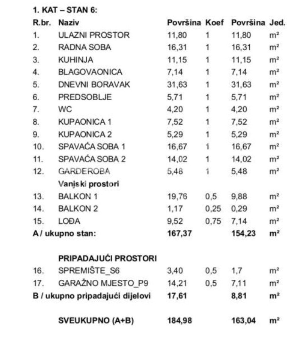 Luksuzni novi stan s bazenom, na prvom katu u centru Varaždina, u ukupnoj veličini od 171, 05 m2. Površinski se sastoji od: ulaznog prostora od 11.57 m2, predsoblja od 5.67 m2, wc-a od 4.01 m2, spavaće sobe od 14.18 m2, kupaonice od 5.62 m2, kupaonice od 6.92 m2, natkrivenog balkona 1. od 0.78 m2, spavaće sobe i garderobe od 24.08 m2, natkrivenog balkona 2. od 9.93 m2, otvorenog prostora kuhinje, blagovaonice i dnevnog boravka od 50.91 m2, radne sobe od 16.47 m2, loggie od 6.65 m2. Stanu pripadaju dva unutarnje garažna parkirna mjesta, svako od 6.32 m2, te spremište od 1.62 m2.