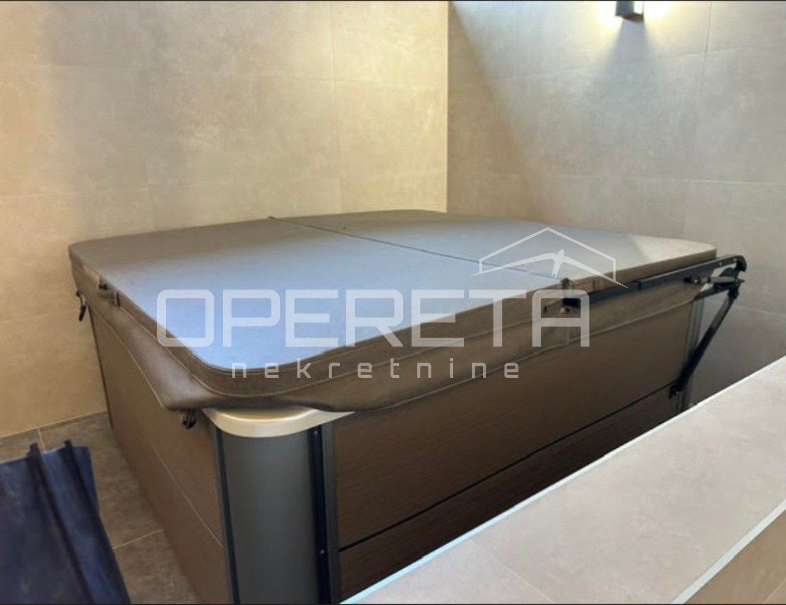U donjem dijelu prizemlja nalazi se zatvoreni grijani bazen, sa spa zonom, koja uključuje prostor za relaksiranje, saunu, tuševe, jaccuzi i teretanu. KUPCI NE PLAĆAJU POREZ NA PRIJENOS VLASNIŠTVA.