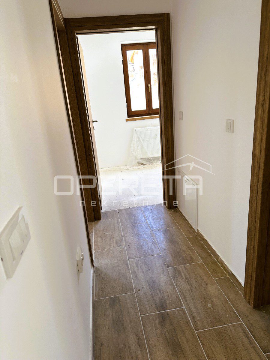 Stan na prvom katu u novogradnji od 54,67 m2 u centru Varaždinskih toplica, 80-ak metara od Minerve i liječilišta u strogo zaštićenom centru grada. Vrlo mirna lokacija bez prometa, blizu svih važnih sadržaja. Kuća novogradnja u stilu tradicijske gradnje, sa energetskih certifikatom A u roh- bau izvedbi. Potrebno je ugraditi parkete u sobe i unutarnju stolariju. Stan ima dimnjak za kamin na kruta goriva, kao alternativa grijanju na plin, ili guštanju uz kamin, što je vrlo rijetko u novogradnji.