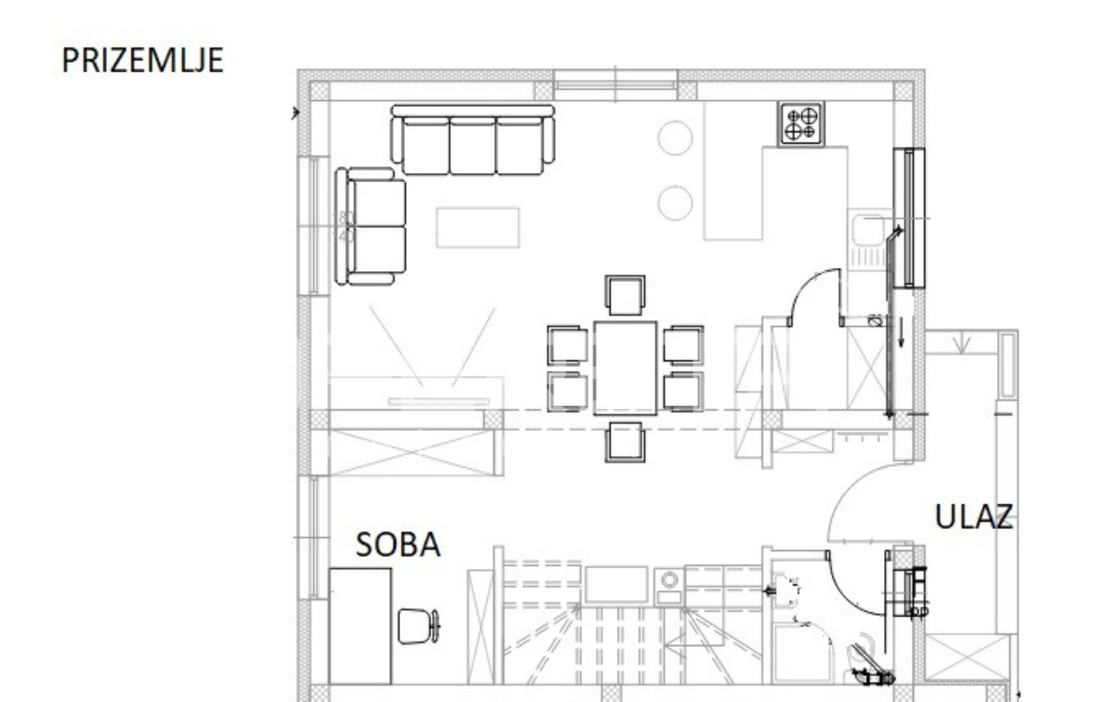 PRIZEMLJE: “open space” dnevni boravak s blagovaonicom, kuhinjom i ostavom, soba i kupaonica s wc-om.