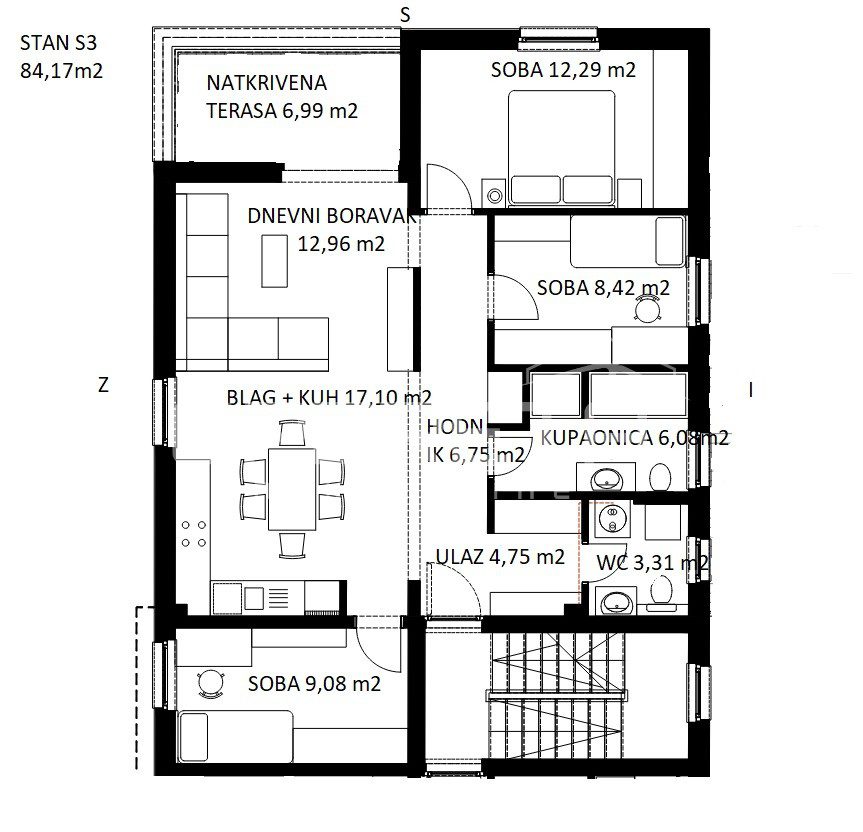 Stan neto unutarnje površine 80.68 m2 uključuje ulazni prostor i hodnik, prostrani dnevni boravak s blagovaonicom i kuhinjom, 3 spavaće sobe, kupaonicu s kadom i tušem te mali dodatni toalet u kojem se nalazi dizalica topline. Efektan dio stana je natkrivena terasa sjeverozapadne orijentacije površine 6.99 m2.