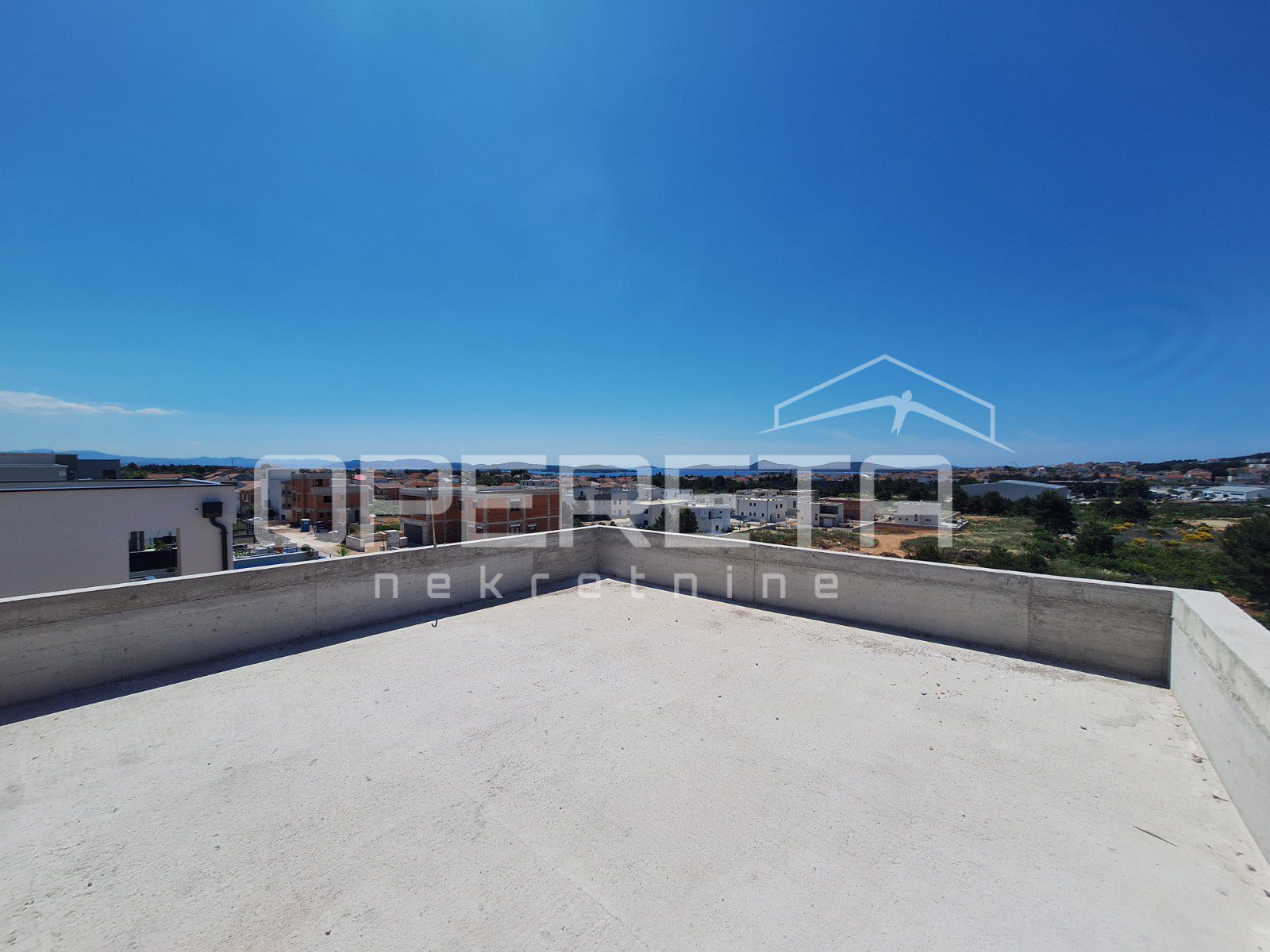 Unutarnjim stubištem pristupa se krovnoj terasi s ljetnom kuhinjom (10m2), toaletom (2,80m2), natkrivenoj terasi (8,50m2) te nenatkrivenoj terasi površine 52m2 s neometanim pogledom na more i otoke. Stanu pripadaju i 2 parkirna mjesta u dvorištu.