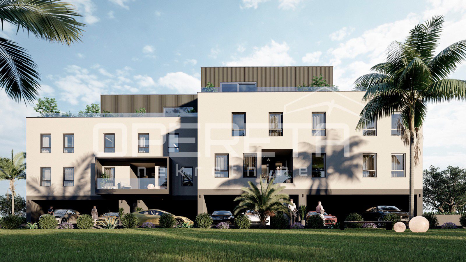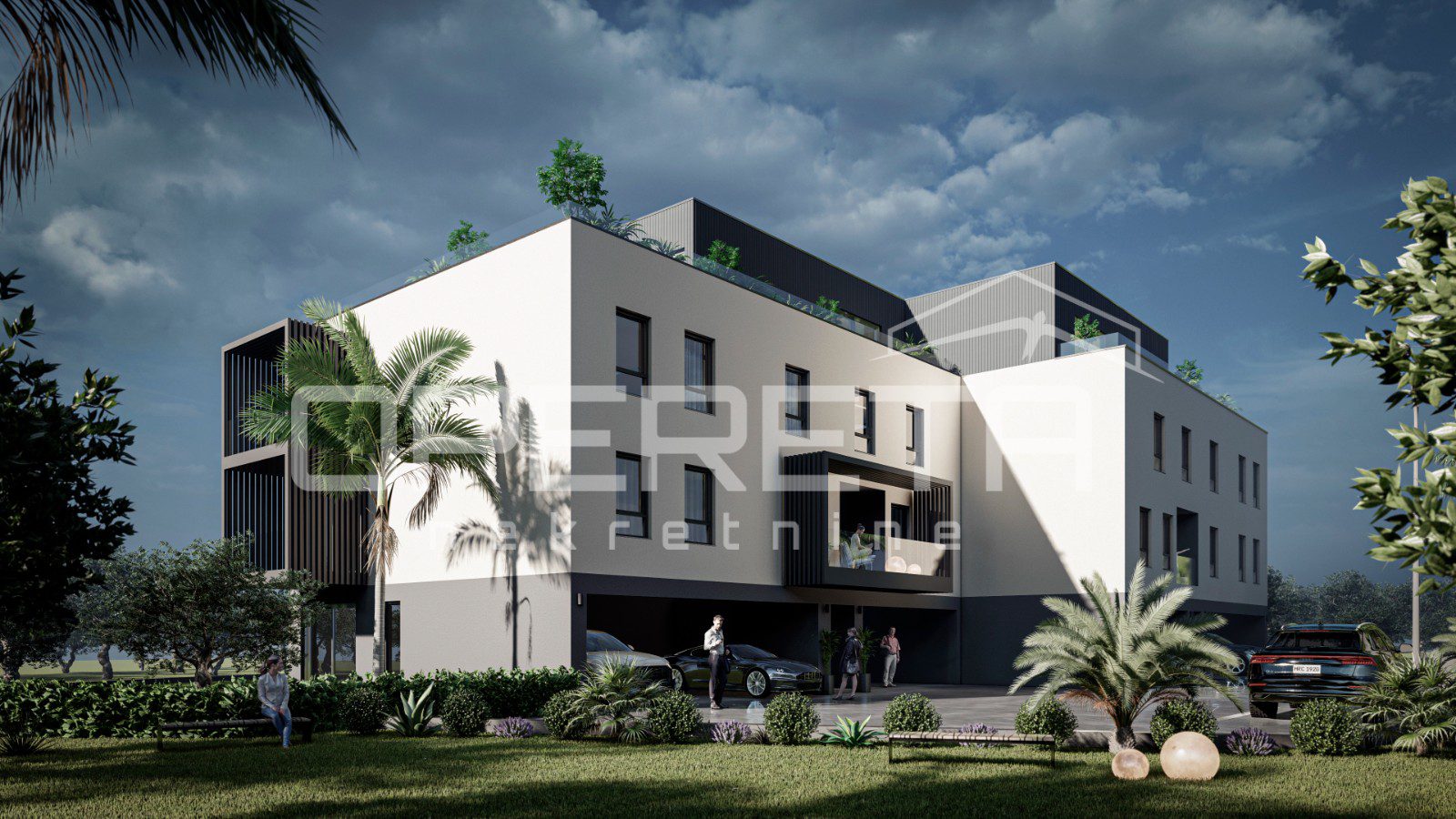 Izgled zgrade je suvremen, s istaknutim dizajnom terasa i uređenom hortikulturom.