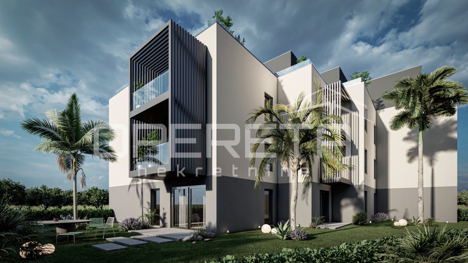 Izgled zgrade je suvremen, s istaknutim dizajnom terasa i uređenom hortikulturom.