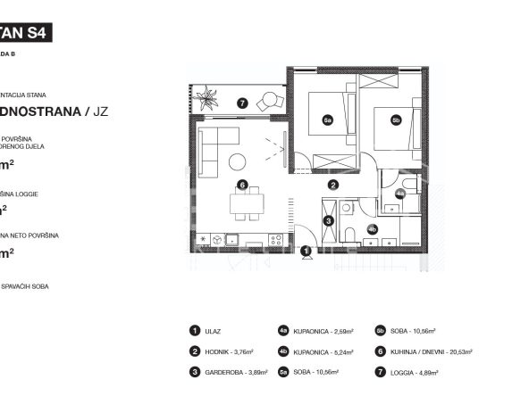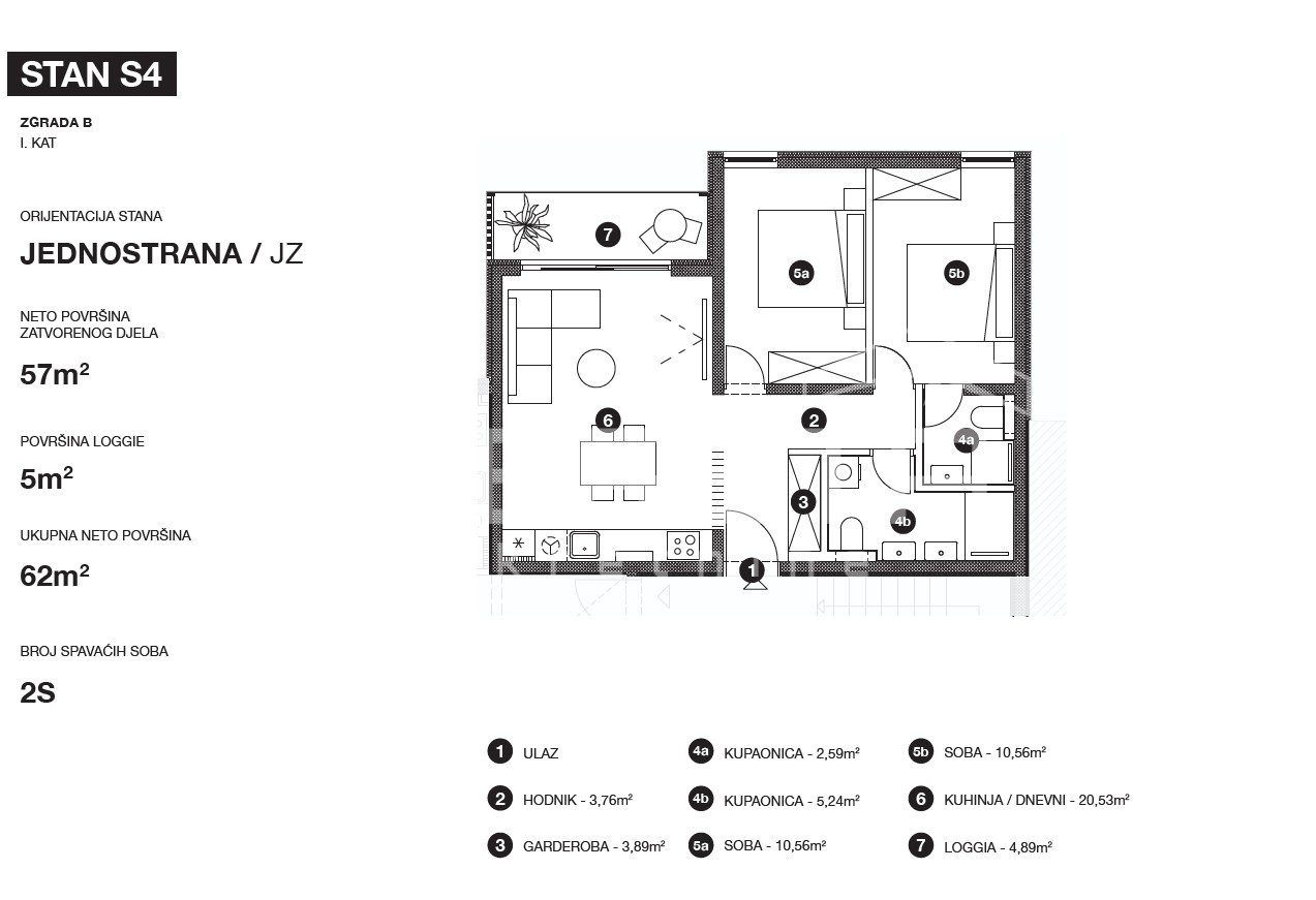 Smješten na prvom katu, sastoji se od dvije spavaće sobe, dnevnog boravka s kuhinjom, dvije kupaonice, hodnika s garderobom i lođe.