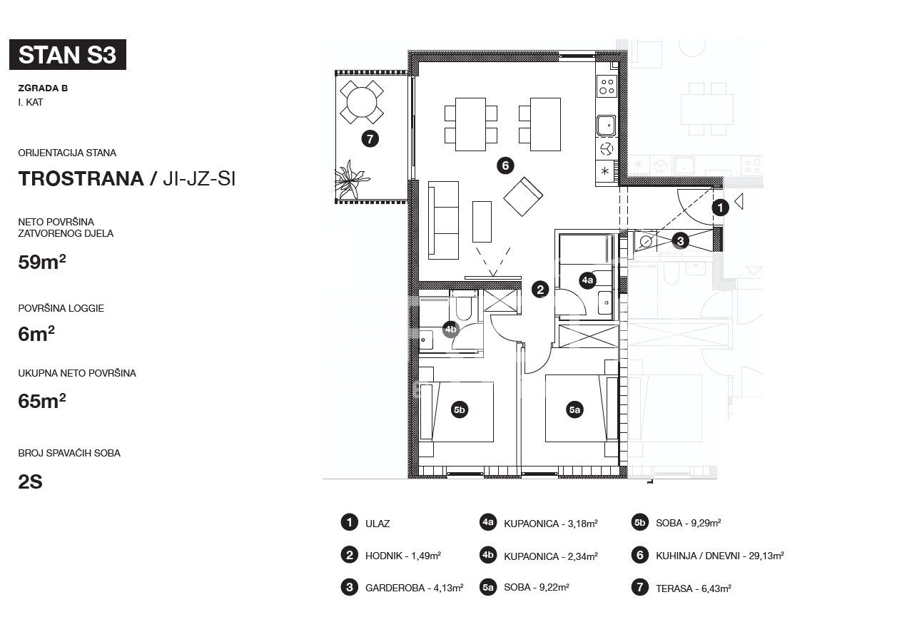 Smješten na prvom katu, sastoji se od dvije spavaće sobe, dnevnog boravka s kuhinjom, dvije kupaonice, hodnika s garderobom i lođe.