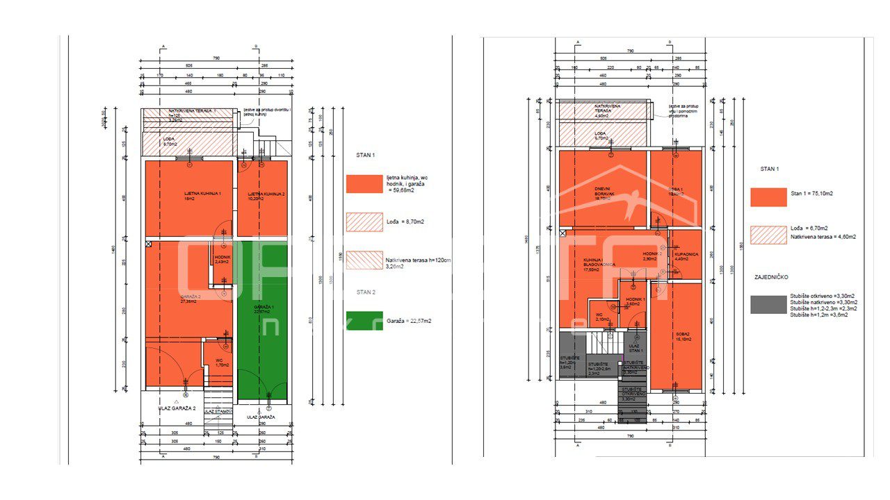 – visoko prizemlje gdje je smješten stambeni dio ukupne korisne površine 75 m2 zatvorenog prostora i terase površine 11 m2