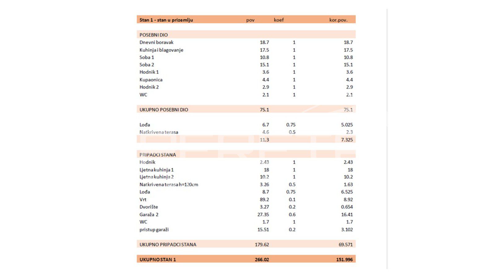 – prizemlja sa dodatne dvije prostorije 18 i 10 m2, terase površine 11 m2, te vrta površine 89 m2.